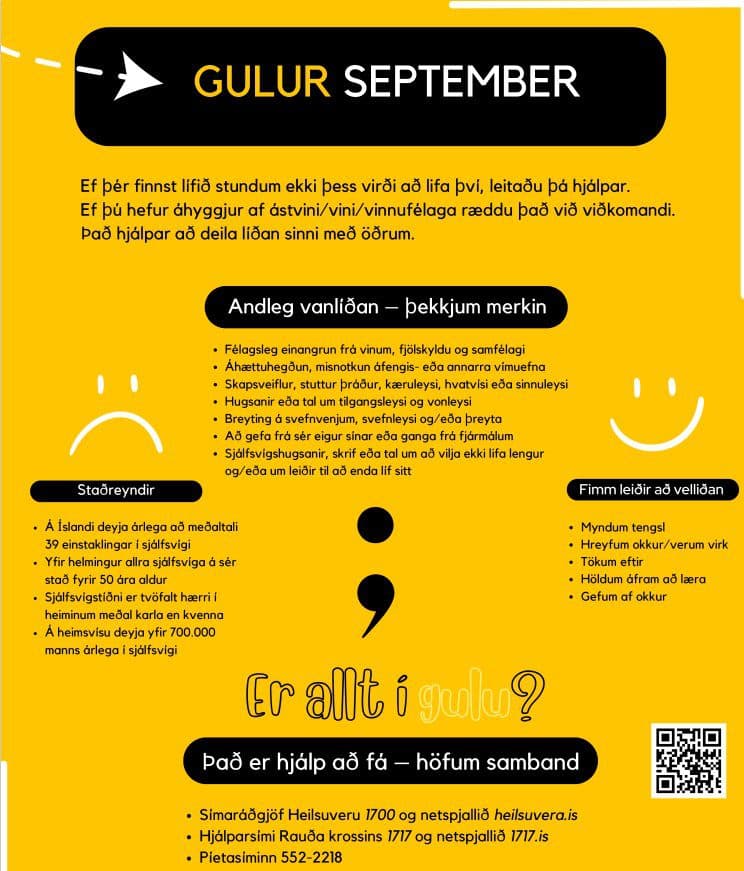 Gulur september er samvinnuverkefni stofnana og félagasamtaka sem vinna saman að geðheilbrigði og sjálfsvígsforvörnum. Á síðastliðnu ári var í fyrsta skipti heill mánuður tileinkaður þessu brýna málefni á Íslandi. Það er von undirbúningshópsins að Gulur september auki meðvitund samfélagsins um mikilvægi geðræktar og sjálfsvígsforvarna og sé til merkis um kærleika, aðgát og umhyggju.