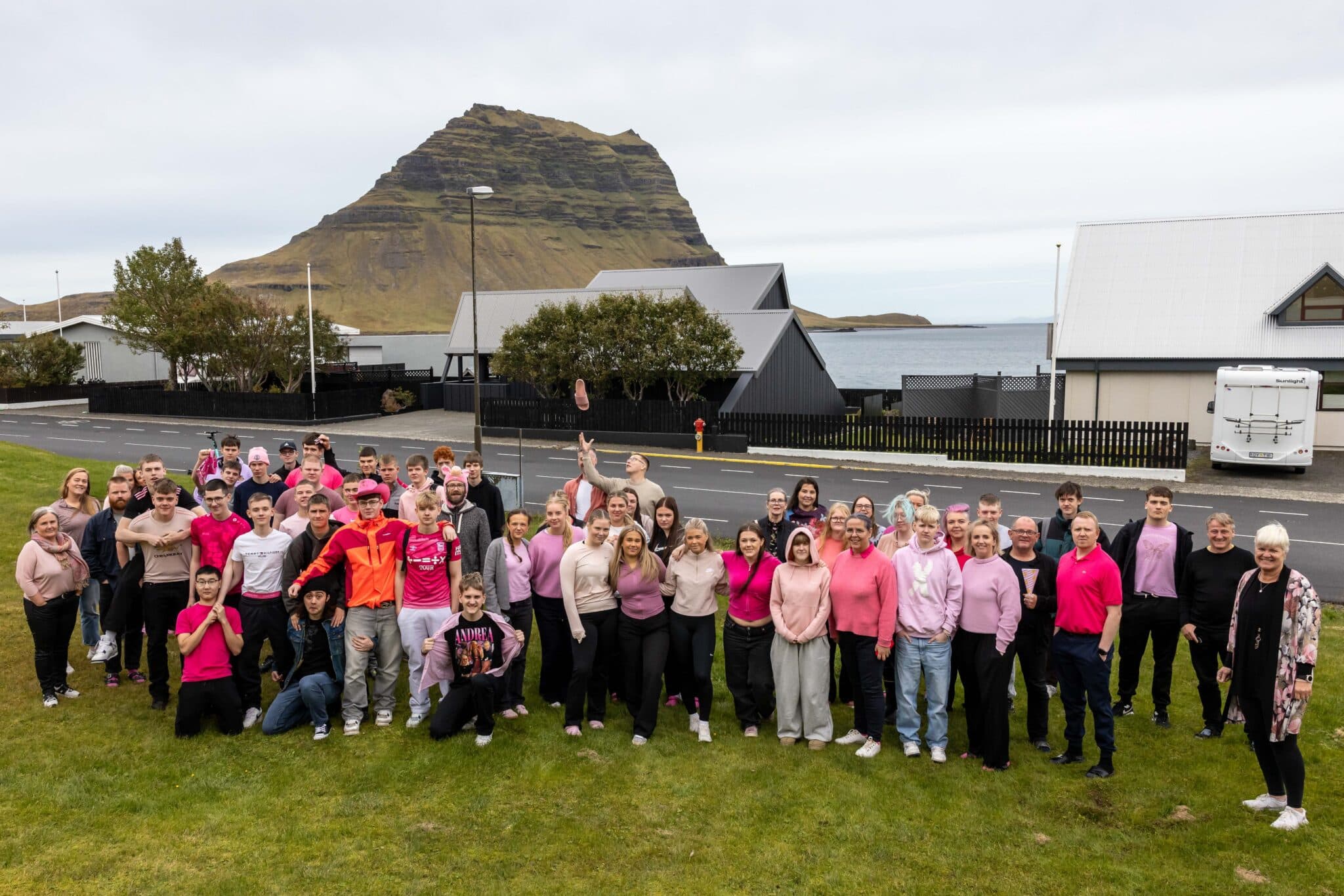 Nemendur og starfsfólk stilltu sér upp fyrir neðan skólann á bleika deginum á mánudaginn. Ljósm. tfk