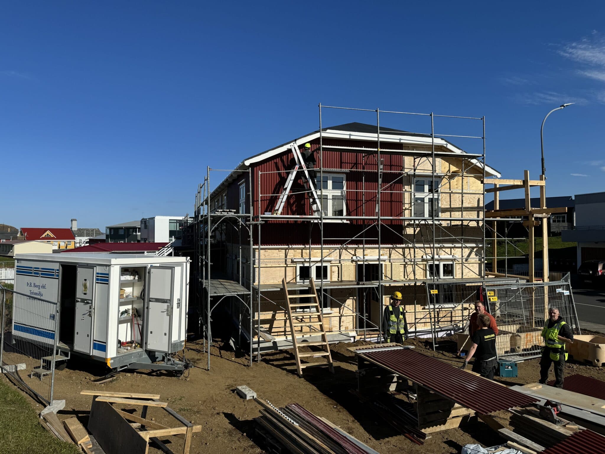 Við Aðalgötu 16 í Stykkishólmi er í smíðum nýtt íbúðarhús á tveimur hæðum en í því verða tvær íbúðir sem nú þegar eru seldar. Iðnaðarmenn voru byrjaðir að klæða húsið með bárujárnsklæðningu og náði Skessuhorn að góma tvo þeirra í stutt spjall. „Það er vöntun á húsnæði hér í Stykkishólmi og okkur langar til að halda áfram að byggja og þétta byggðina í leiðinni,“ segir Páll Vignir Þorbergsson smiður og framkvæmdarstjóri Þ.B. Borg ehf sem stendur að byggingu hússins. En hvenær má vænta verkloka? „Við byrjuðum um leið og búið var að sleppa fé á fjall en húsnæðið verður tilbúið og klárt fyrir sauðburð og þannig viljum við hafa það,“ sagði Hinrik Hjartarson smiður.
