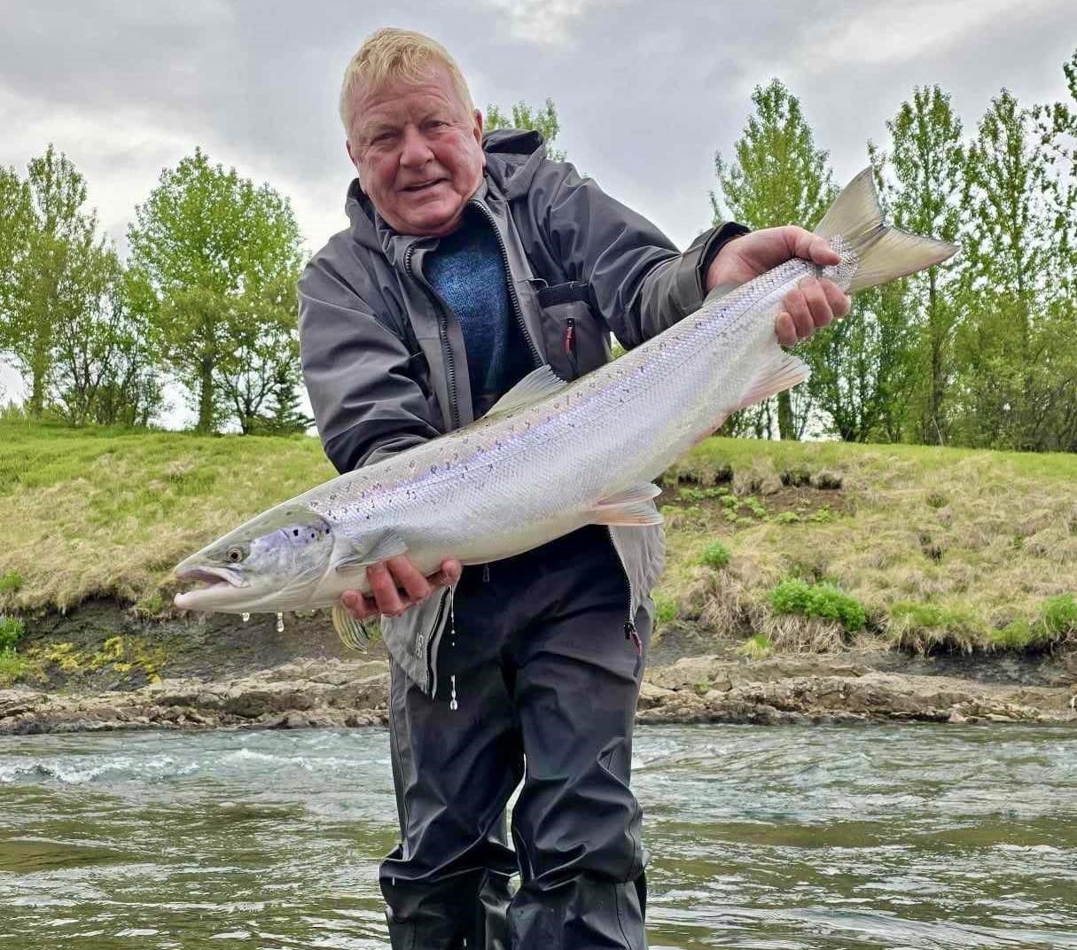 Júlíus Þór Jónsson með fyrsta laxinn úr Grímsá í Borgarfirði að morgni þjóðhátíðardagsins í sumar. Grímsá er komin á þriðja hundrað laxa yfir heildarveiðina í fyrra. Ljósm. gb