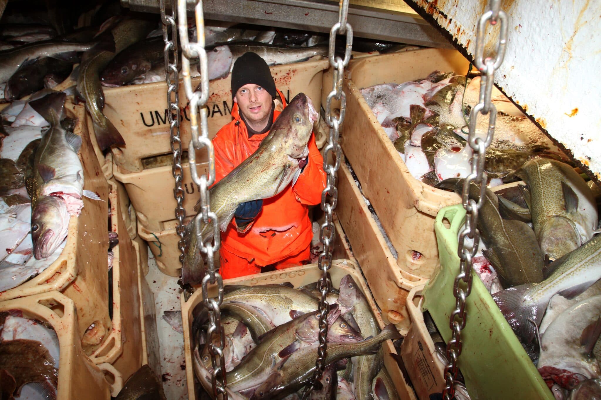 Kristmundur Sumarliðason skipveri á dragnótarbátnum Sveinbirni Jakobssyni SH í lestinni. Þorskur er sem fyrr verðmætasta útflutningsvaran. Ljósm. úr safni/af.