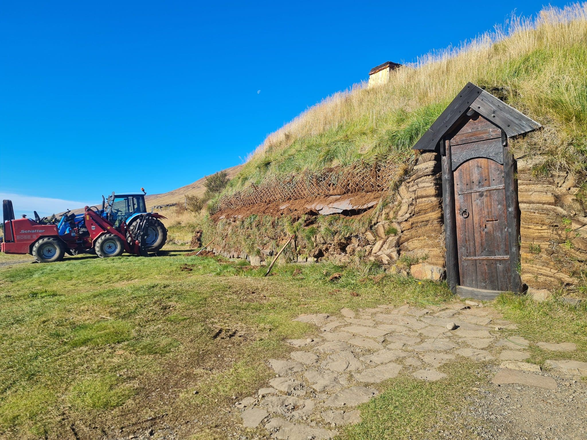 Hafnar eru framkvæmdir á suðurvegg tilgátuskálans á Eiríksstöðum í Haukadal, en Fornverkaskólinn ásamt Reyni Guðbrandssyni frá Jörva sjá um verkið. Í samtali við Skessuhorn segir Reynir að unnið verði að viðgerðum á vegg og þaki skálans. „Við munum einbeita okkur að suðurhliðinni í ár, rífum niður hlaðna vegginn og lögum þakklæðningu en við fengum til liðs okkur Helga Sigurðsson hleðslumeistara og félaga frá Fornverkaskólanum. Þeir stungu niður í sumar mikið magn af klömbru sem hefur fengið að þorna og verður hún svo sett í vegginn ásamt grjóti. Við munum svo skera streng nú á næstum dögum og notum það efni í þakvinnu,“ segir Reynir.