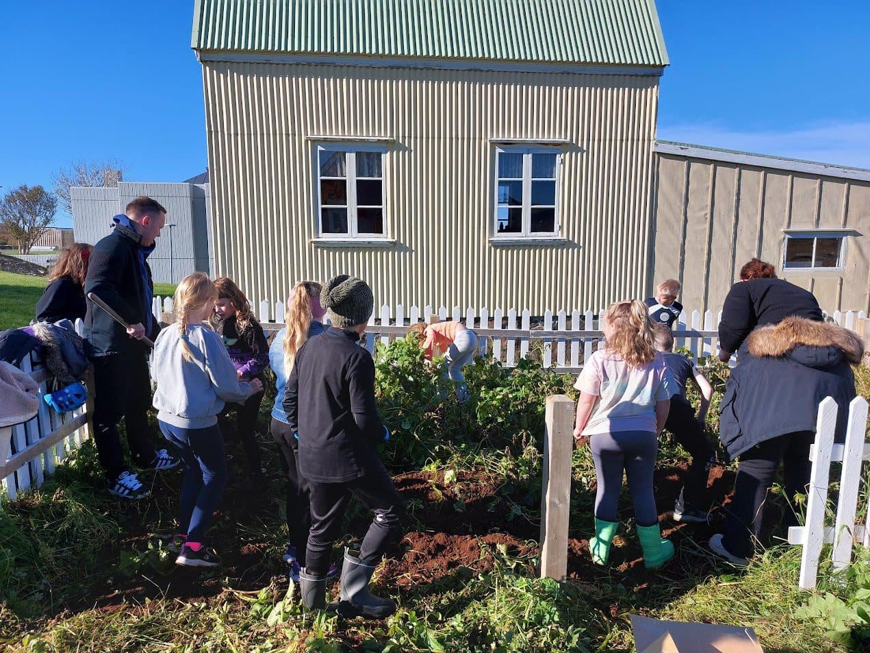 Á Byggðasafninu í Görðum á Akranesi er lítill kartöflugarður við hliðina á húsinu Söndum á safnasvæðinu sem Brekkubæjarskóli hefur til afnota fyrir kartöflubændur í 3. og 4. bekk skólans. Fram kemur á FB síðu skólans að á vorin fara sumsé krakkarnir í 3. bekk og setja niður kartöflur og mæta svo aftur að hausti sem fjórðu bekkingar og ná í uppskeruna. 4. bekkur fór einmitt á dögunum og tók upp kartöflurnar sínar. Uppskeran var með miklum ágætum og þegar allar voru komnar upp úr moldinni þurfti að vigta þær og skipta jafnt á milli krakkanna. Fékk hver og einn nemandi poka í hönd til að taka með sér heim í soðið. Virkilega skemmtilegt verkefni og krakkarnir voru kátir með uppskeruna.