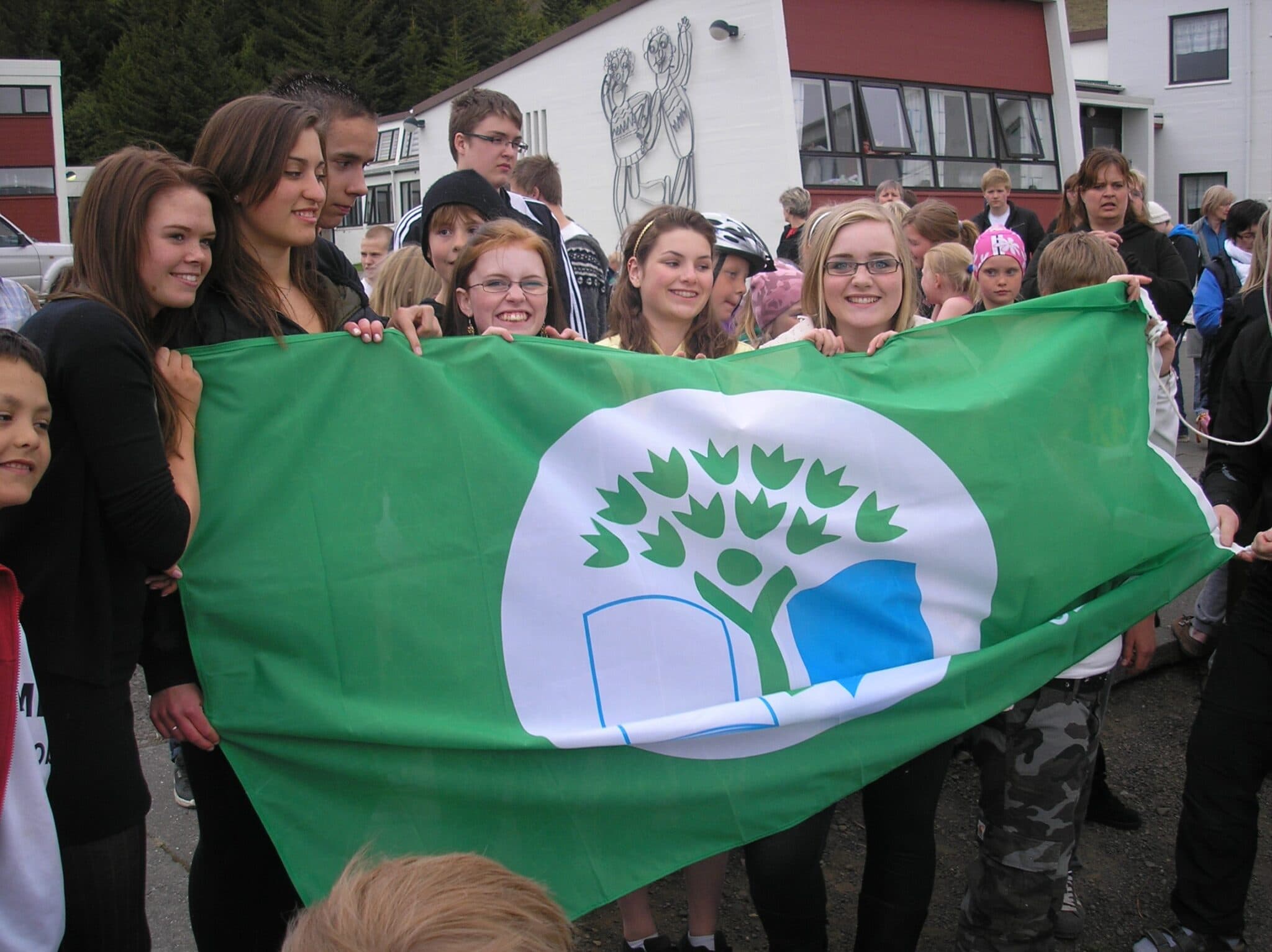 Vorið 2010 fékk Varmalandsskóli í Borgarfirði að flagga hinum eftirsóknarverða Grænfána eftir tveggja ára vinnu nemenda og starfsfólks við að ná settum markmiðum í umhverfismálum. Myndin er frá þeim viðburði úr safni Skessuhorns, en þess má geta að unga fólkið á þessari mynd er um þrítugt í dag.