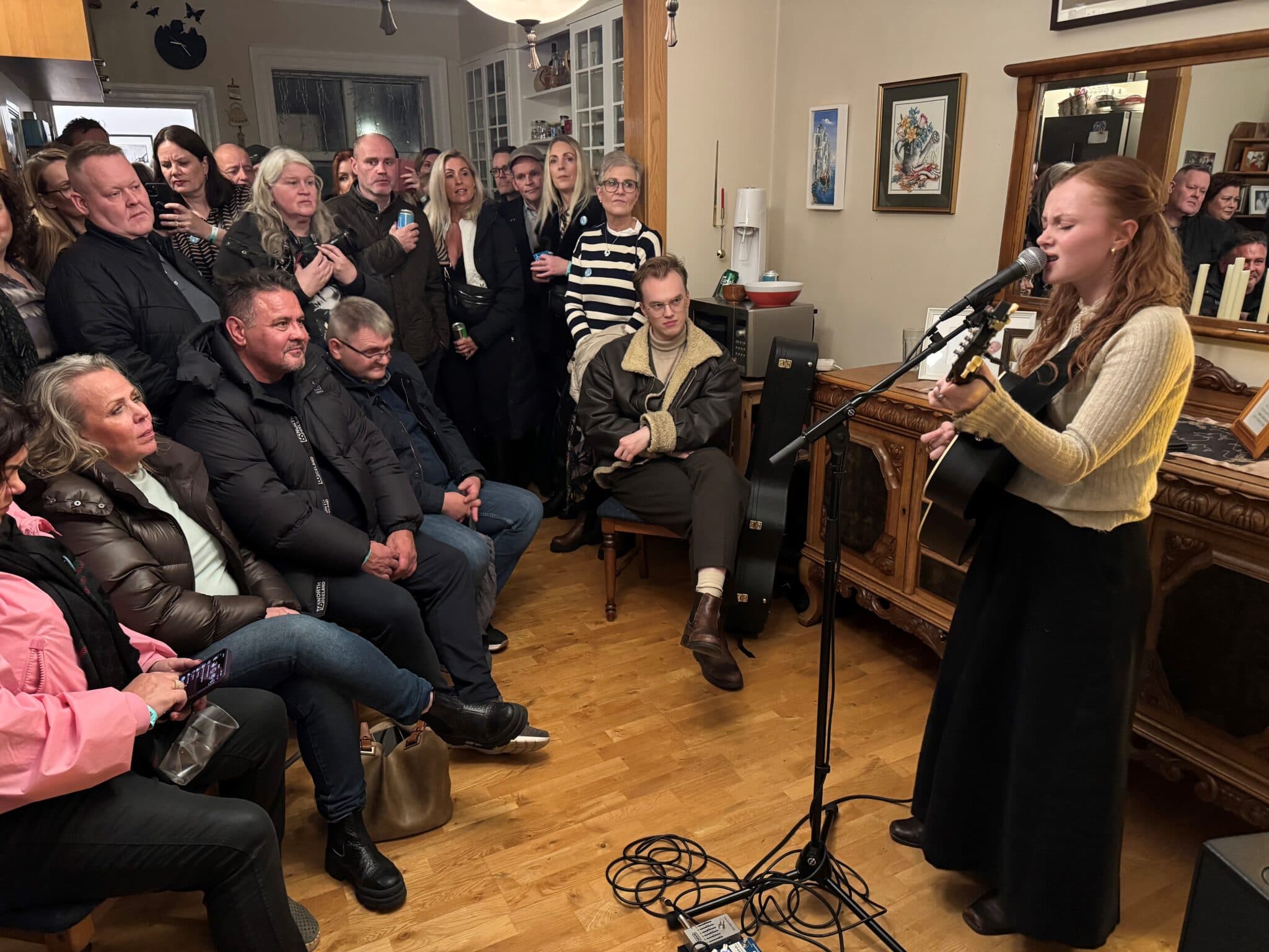 Næst var ferðinni heitið á Vesturgötu 45 heima hjá Kristjáni og Grétu þar sem tónlistarkonan Elín Hall tróð upp. Þrátt fyrir tæknilega byrjunarörðugleika lét hún það sig ekki á fá og spilaði mest lög af nýjustu plötu sinni, heyrist í mér?, sem kom út í fyrra. Þar mátti heyra lög eins og Heim, Bankastræti, Júpíter, Manndráp af gáleysi og Blóðsugan. Hún flutti einnig fyrsta lagið sem hún samdi þegar hún var 16 ára gömul og sendi í Eurovision árið 2015 en það heitir Í kvöld. Þá flutti hún nýtt lag sem heitir Grimmhildur Grámann og endaði á laginu Vinir af nýju plötunni sem er eitt af hennar bestu og vinsælustu lögum. Elín er með hlýlega sviðsframkomu og góða rödd og sagði gestum frá tilurð laganna sem og aðrar skemmtilegar sögur enda hlaut hún góðar viðtökur þeirra fjölmörgu sem hlýddu á hana þetta kvöld.