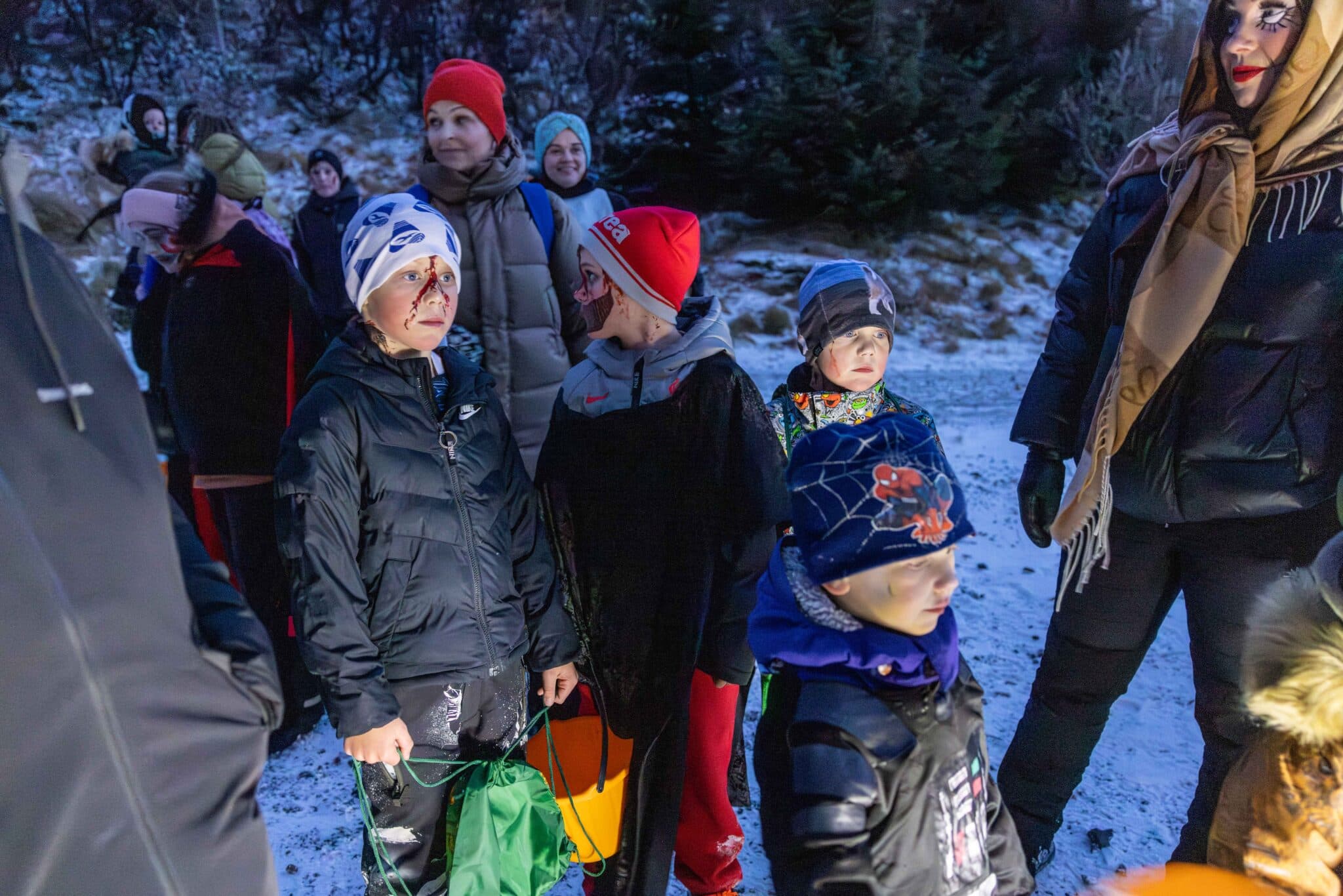 Spenntir krakkar bíða í röð eftir að heimsækja draugaskóginn þar sem íbúar við skógræktina voru búnir að leggja metnaðarfullar og hræðilegar skreytingar fyrir krakkana. Ljósmyndir: tfk