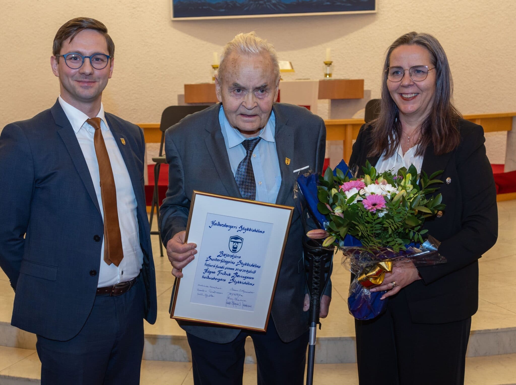 Jakob Björgvin S. Jakobsson bæjarstjóri Sveitarfélagsins Stykkishólms, Högni Bæringsson heiðursborgari Stykkishólms og Hrafnhildur Hallvarðsdóttir forseti bæjarstjórnar. Ljósm. sá