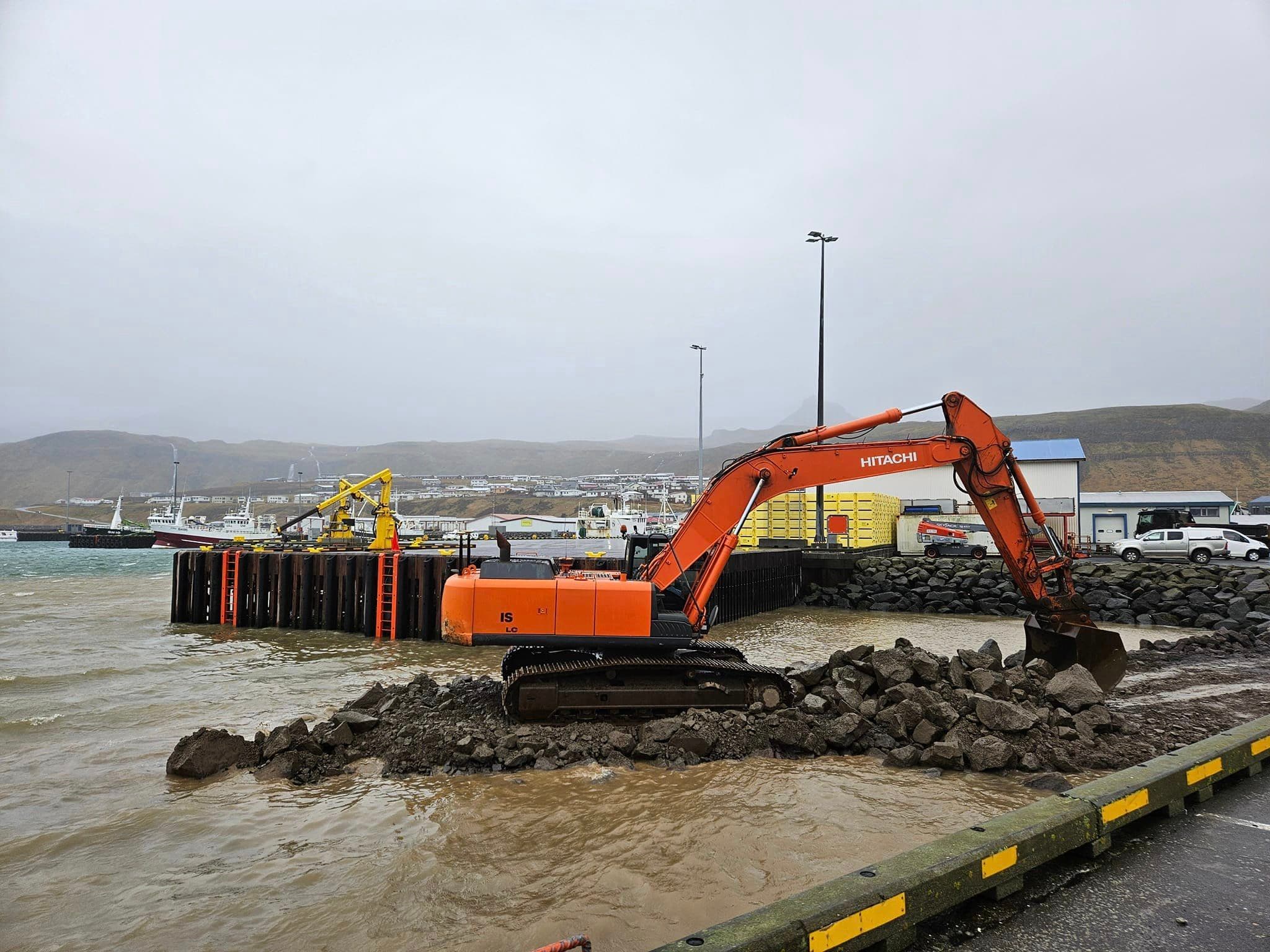 Þessa dagana standa yfir dýpkunarframkvæmdir fyrir framan nýju trébryggjuna við höfnina í Ólafsvík. Til að auðveldara verði fyrir verktakann að athafna sig er búið er að keyra út fyllingu í höfnina. Þar er svæði sem þarf að dýpka þannig að full not verði á bryggjunni og verður fleygað úr klöpp í botni hafnarinnar svo að dýpið við bryggjuna verði ekki undir þremur metrum.