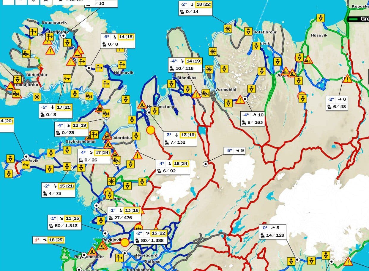 Gular og appelsínugular veðurviðvaranir Veðurstofunnar eru í gildi fyrir mestallt landið í dag. Á Umferðin.is kemur fram að hálka eða hálkublettir eru á flestum leiðum í landshlutanum og eitthvað um éljagang. Á Kjalarnesi þurfa ökumenn að gera ráð fyrir að grjót og leðja geti verið á veginum eftir sjógang. Á Fróðárheiði á Snæfellsnesi er óveður og því mjög varasamt að vera þar á ferð. Á Holtavörðuheiði eru hálkublettir og éljagangur og enn er óvissustig í gildi á veginum. Í Dölum er varað við slæmu ástandi vegarins við Gröf vegna brothola á stuttum kafla. Ökumenn eru beðnir um að draga úr hraða og aka varlega um svæðið.