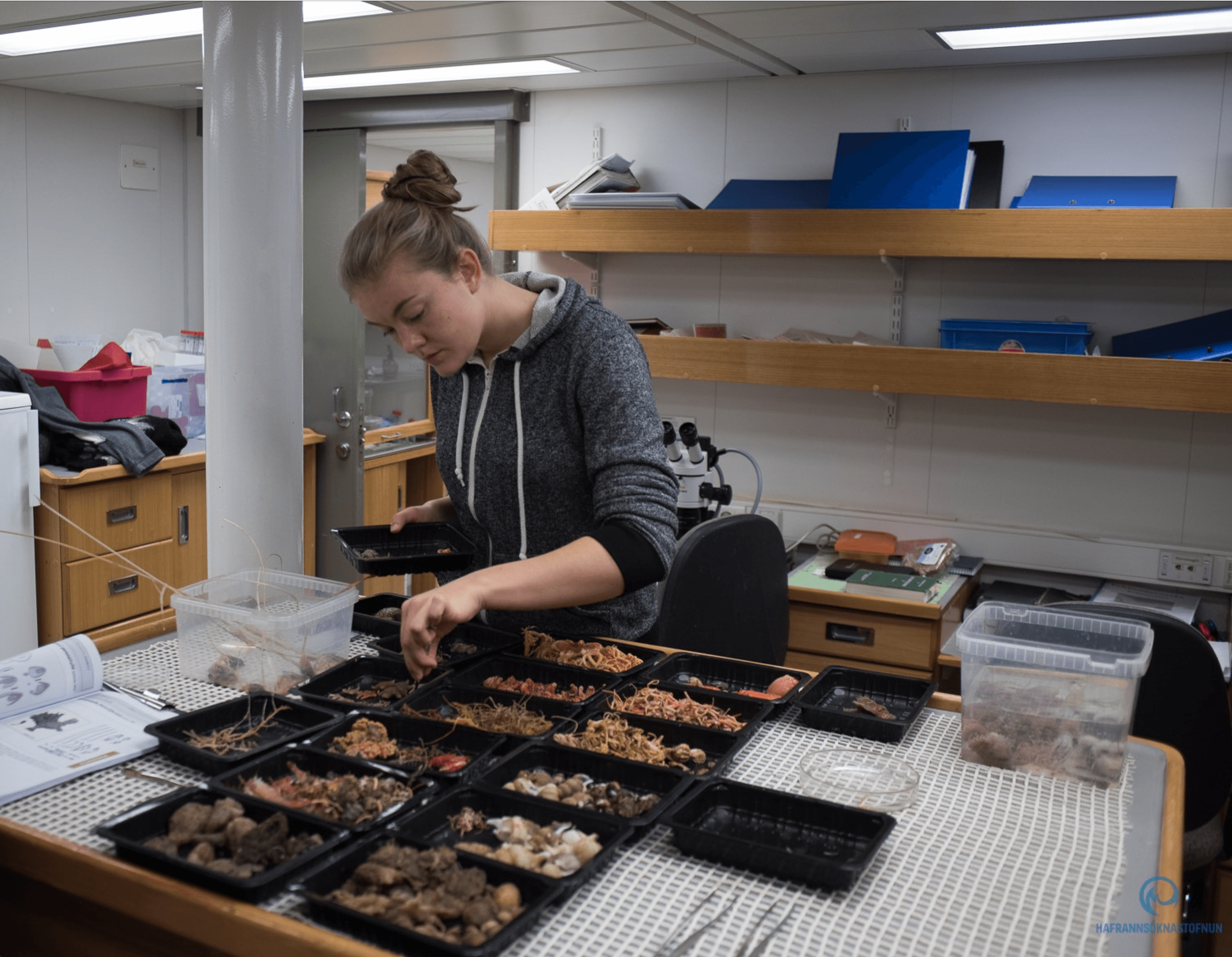 Bylgja Sif Jónsdóttir leiðangursstjóri flokkar botndýr af sjávarbotni. Ljósm. aðsend.