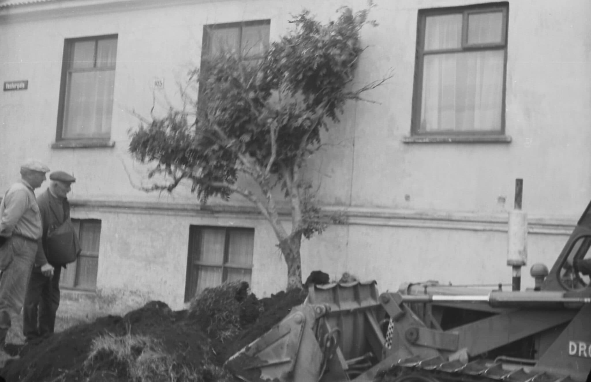 Hér kemur annar myndapistillinn minn úr gömlu myndasafni. Nú hverfum við fimmtíu til sextíu ár aftur í tímann með myndum af æskuslóðunum á Vesturgötunni á Akranesi. M.a. myndum af því þegar reynitré var fjarlægt við húsið Garðbæ, sem var nr 105 við Vesturgötu, beint niður af Merkigerðinu.