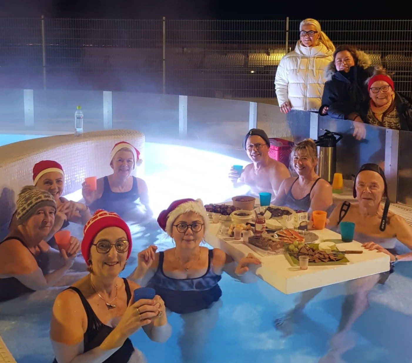 Það er alltaf dágóður hópur fólks sem hefur fyrir venju að mæta eldsnemma á morgnana í heita pottinn á Jaðarsbökkum á Akranesi. Þannig hefur hópurinn upplifað margar dagrenningarnar, upphaf eldgosa á Reykjanesi og sagt hvert öðru sögur. Í morgun var boðið til veislu eins og sjá má. Hópurinn sendir íbúum og öðrum Vestlendingum góðar jólakveðjur.
