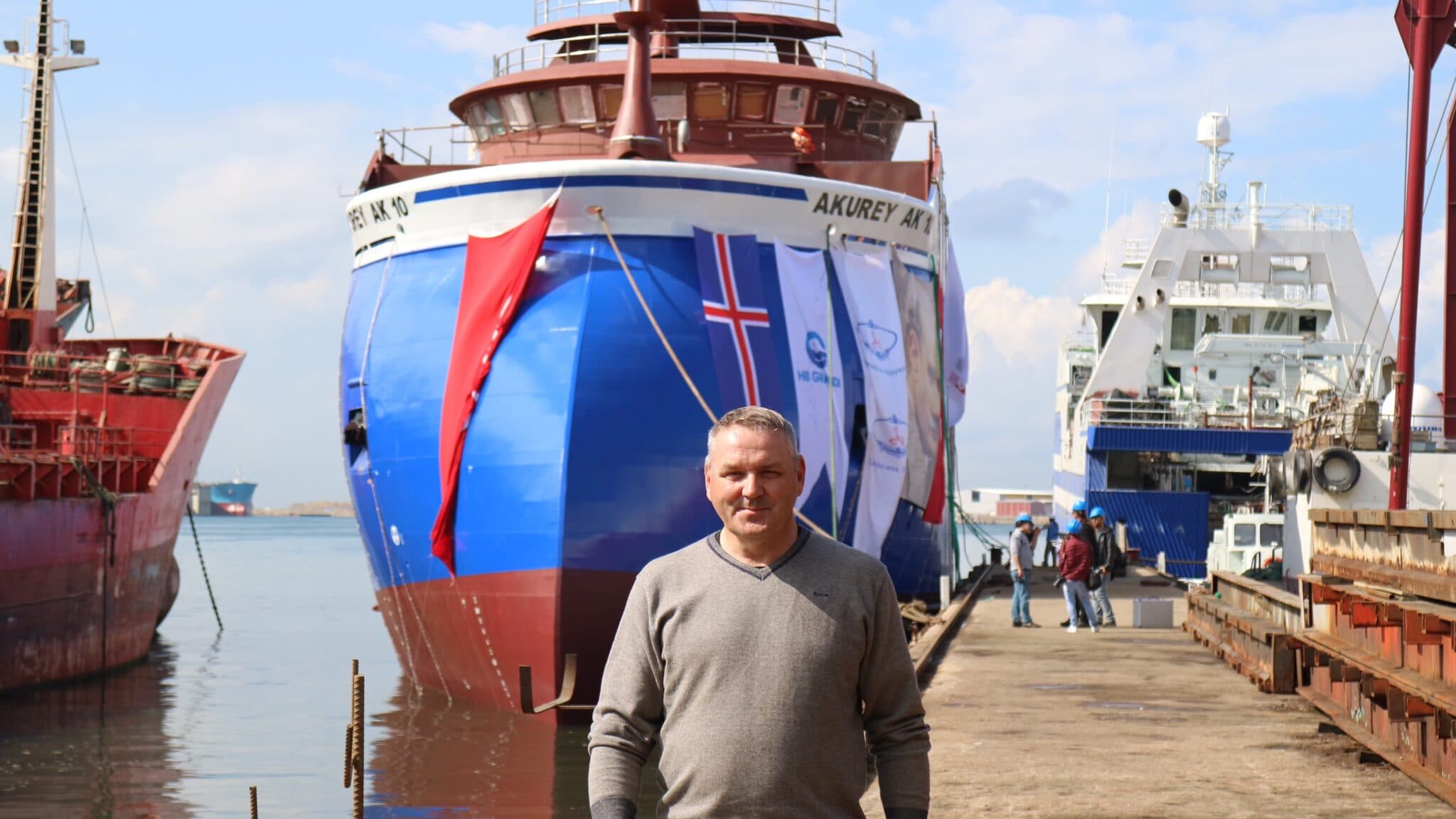 Eiríkur við sjósetningu Akureyjar í Tyrklandi árið 2017.