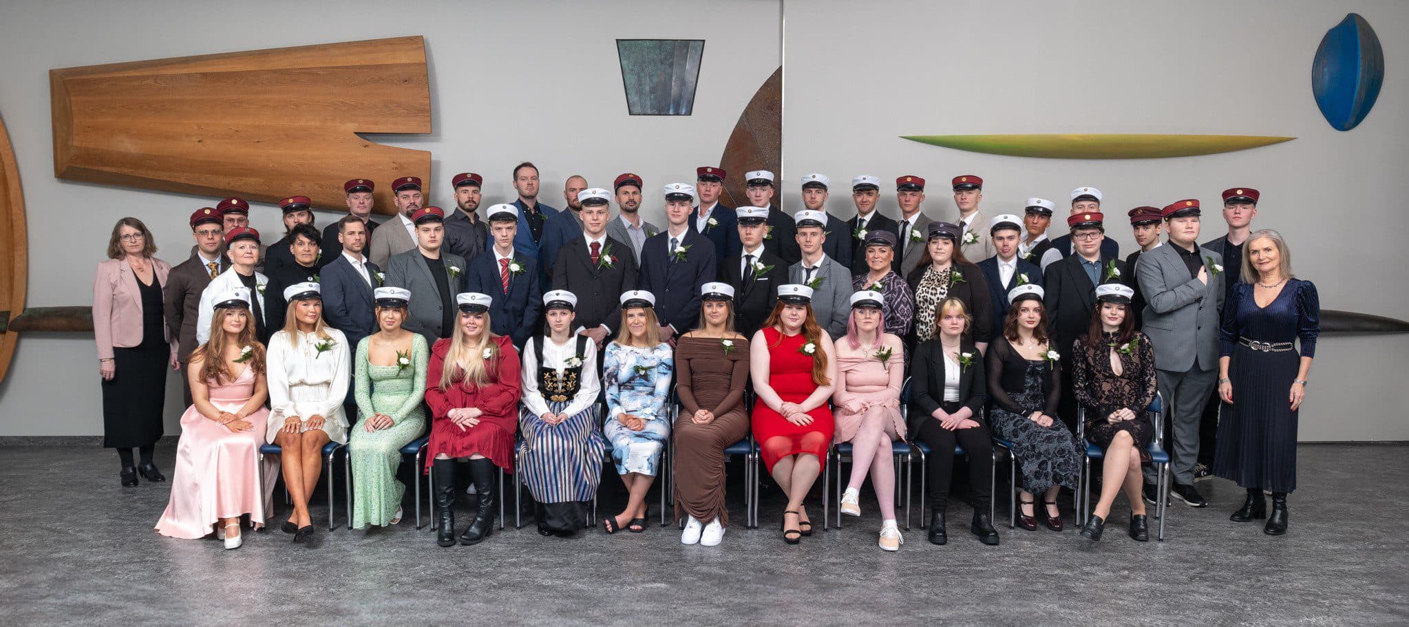 Útskriftarhópurinn ásamt skólameistara og aðstoðarskólameistara. Ljósm. Blik studio
