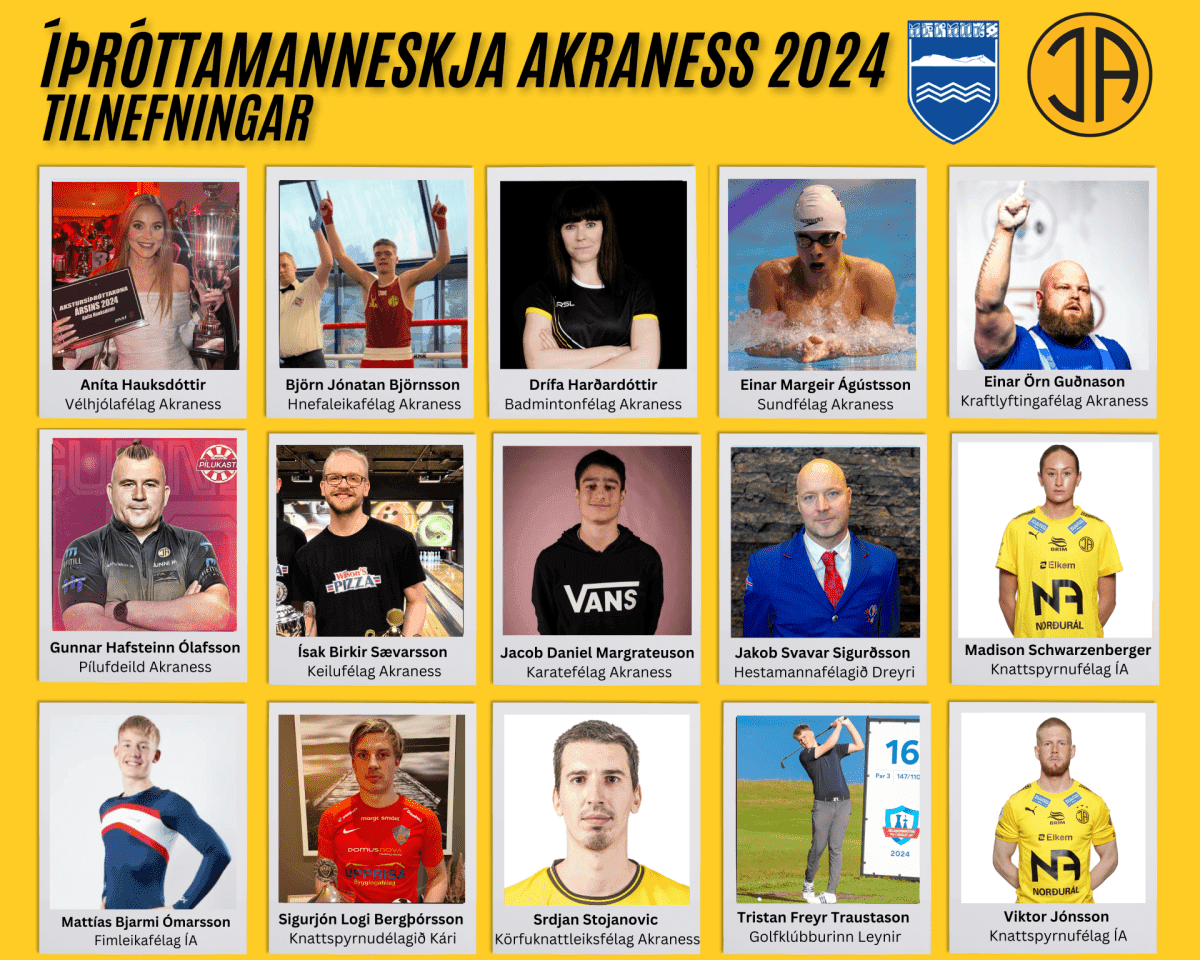 Á þrettándanum 6. janúar næstkomandi verður tilkynnt um val á íþróttamanneskju Akraness árið 2024. Nú hefur verið opnað fyrir kosningu í þjónustugátt Akraneskaupstaðar og verður hún opin frá 27. desember til og með 2. janúar. Alls eru 15 manns tilnefnd að þessu sinni og eru hér í stafrófsröð: