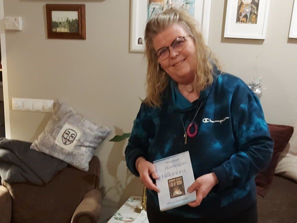 Birna G. Konráðsdóttir með fyrstu bókina, glóðvolga út prentsmiðjunni korteri fyrir jól.