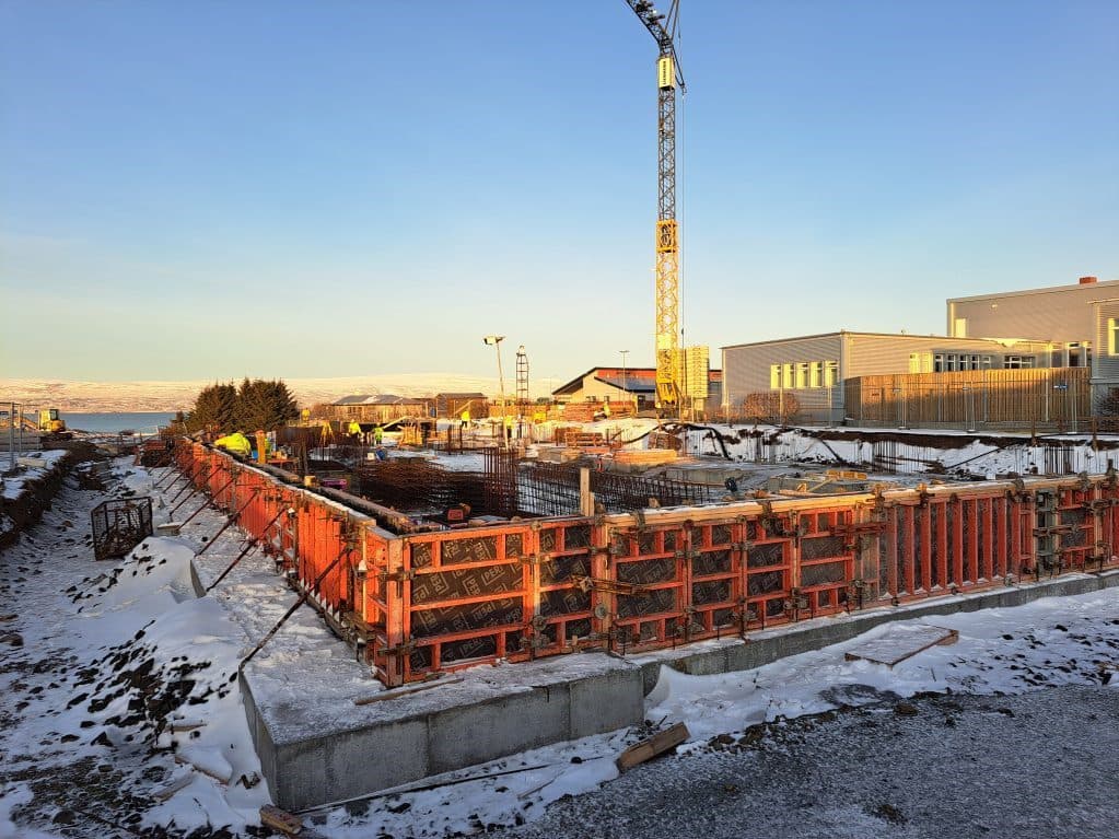 Uppsláttur sökkulveggja undir íþróttasalnum. Ljósm. dalir.is