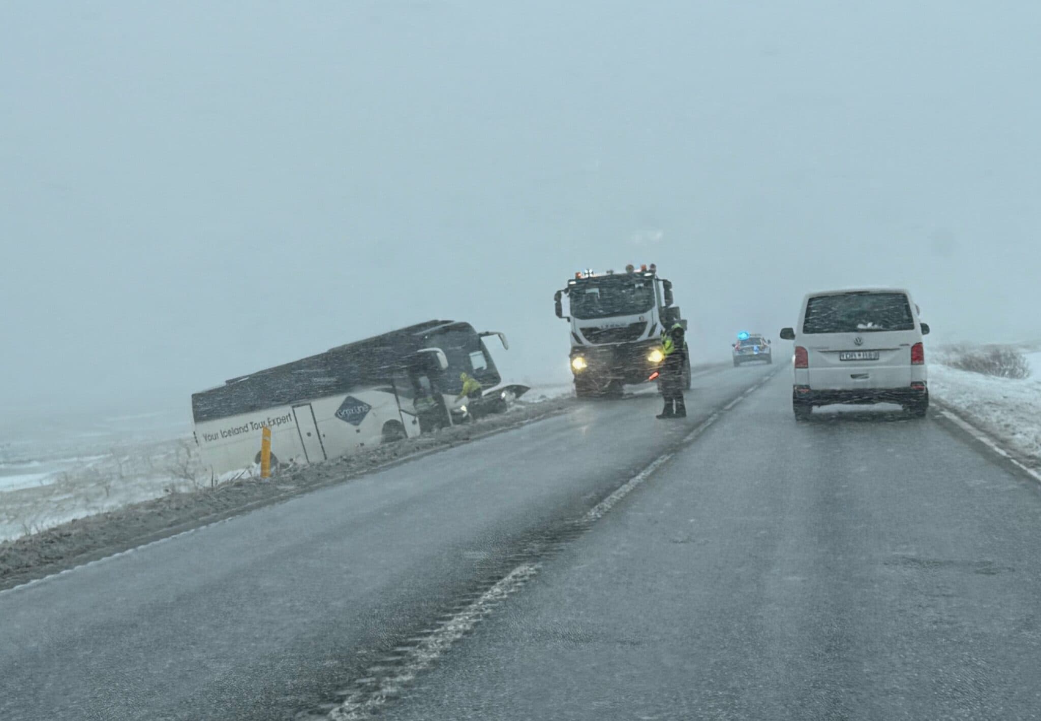 Bálhvasst er nú orðið á helstu stofnleiðum, svo sem á Kjalarnesi og við Hafnarfjall. Nú fyrir skömmu stýrði lögregla umferð framhjá hópferðabíl sem lent hafði utan vegar á Kjalarnesi í austan roki. Við Hafnarfjall er nú vaxandi vindur sem fer í 44 metra á sekúndu í hviðum. Þar er því ekkert ferðaveður eins og sakir standa. Á Kjalarnesi er heldur hægari vindur. Útnesvegur á Snæfellsnesi er lokaður sem og Fróðárheiði. Víða er hált og skafrenningur og er fólk hvatt til að fylgjast vel með veðri og umferð á umferdin.is