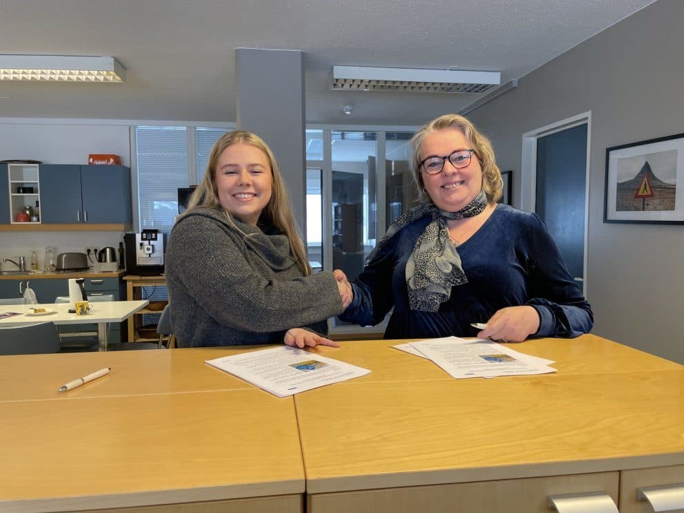 Margrét Björk, fagstjóri áfangastaða- og markaðssviðs SSV, og Thelma Harðardóttir hjá Haukey við undirritun samnings. Ljósm. west.is.
