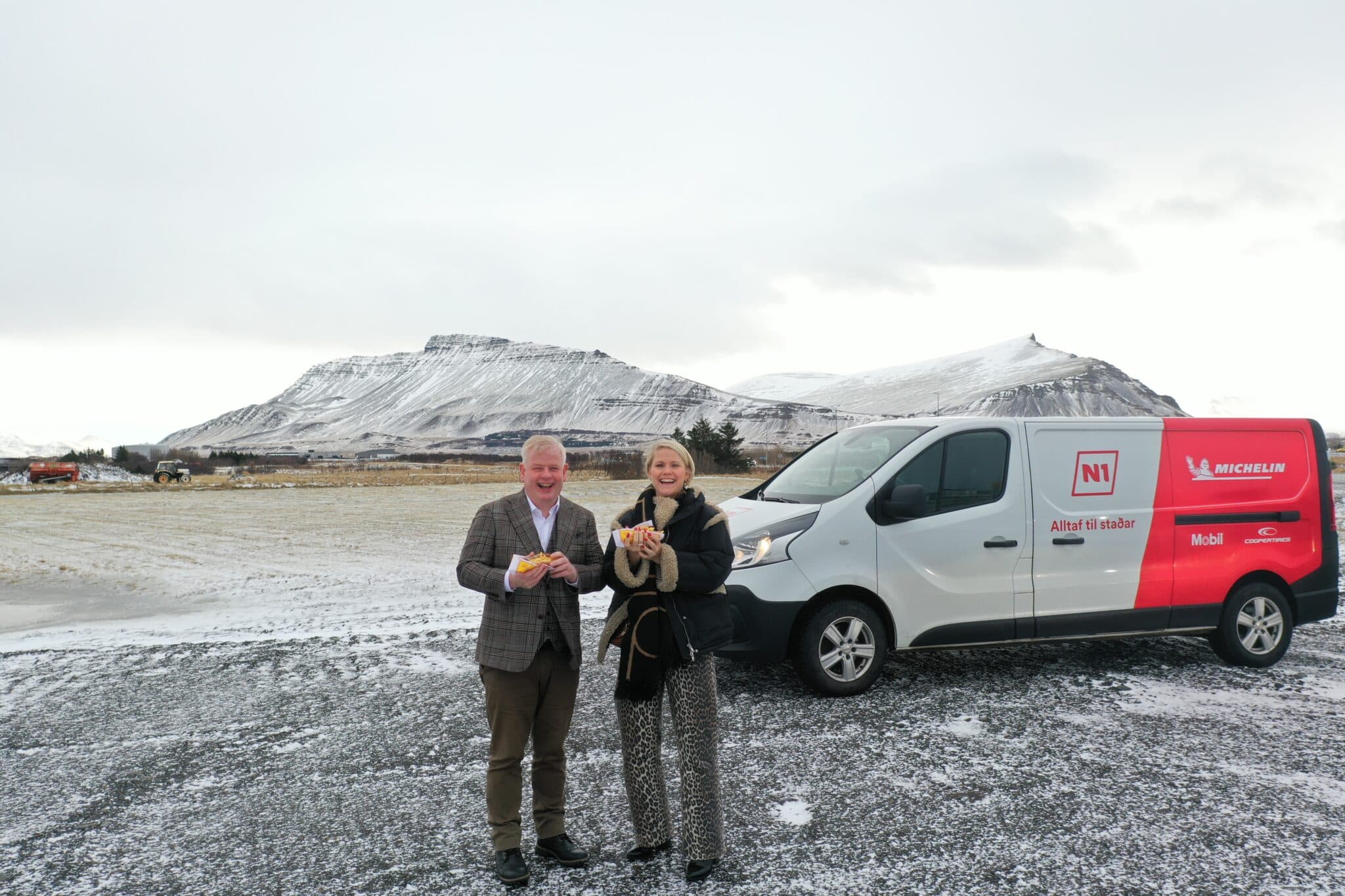 Eftir undirritun samninga fór fram táknræn athöfn á lóðinni Elínarvegi 3 þar sem Haraldur bæjarstjóri og Ásta S Fjeldsted forstjóri Festi snæddu fyrstu af væntanlega mörgum Skútupylsum á nýjum stað. Ljósm. mm