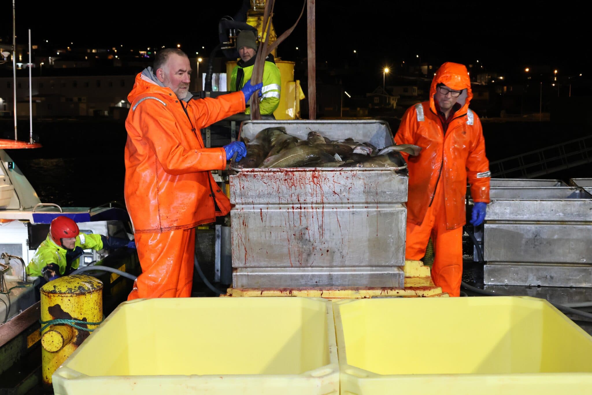 Hjörtur Sigurðsson og Víðir Haraldsson að landa úr línubátnum Kviku samtals um 10 tonnum. Fjær glittir í Ómar Gilsfjörð sem sá um að hífa aflann frá borði í Ólafsvík. Ljósmyndir: af