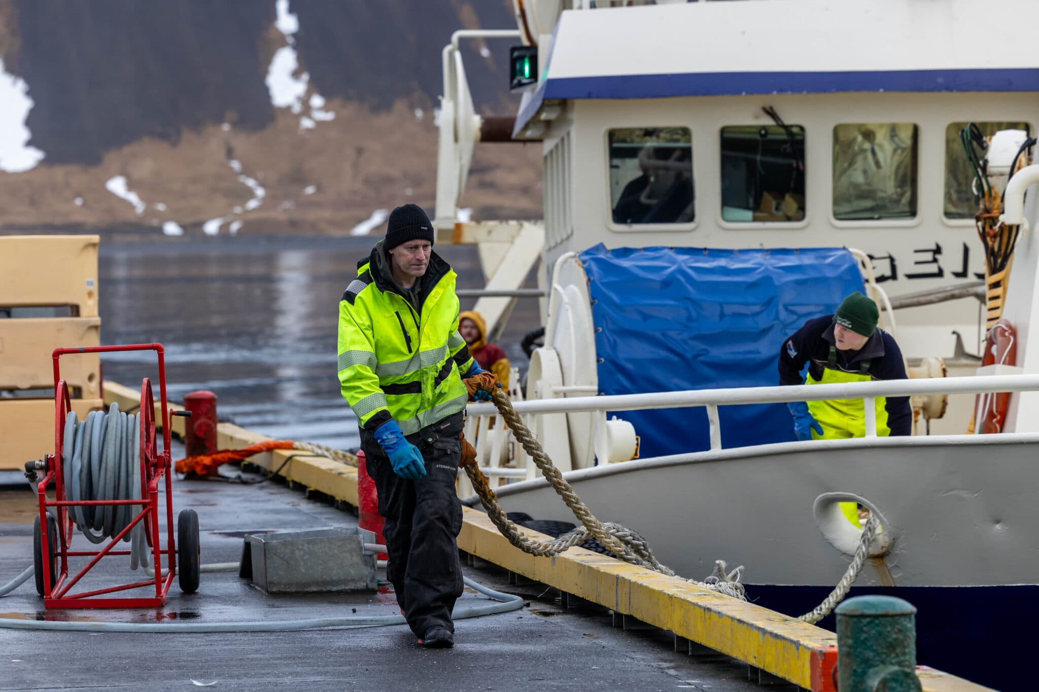Steinar Þór Alfreðsson hafnarstarfsmaður tekur á móti netabátnum Geir á fimmtudaginn. Ljósm. tfk