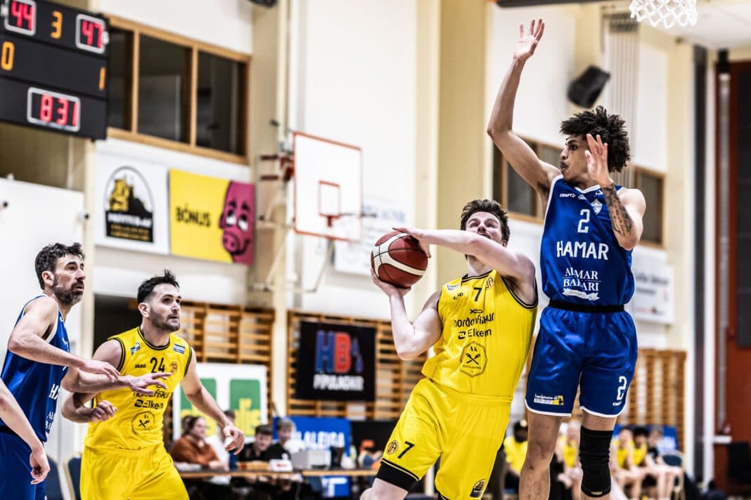 ÍA og Hamar tókust á í toppbaráttu 1. deildar karla í körfuknattleik í gærkvöldi og fór leikurinn fram fyrir fullu húsi í íþróttahúsinu við Vesturgötu en alls mættu yfir fimm hundruð manns. Fyrir leik hafði ÍA, með tíu sigurleikjum í röð, komið sér þægilega fyrir í toppsæti deildarinnar á meðan Hamarsmenn höfðu hikstað í síðustu tveimur leikjum sem þeir töpuðu báðum í framlengingu, eftir níu sigurleiki í röð þar á undan.