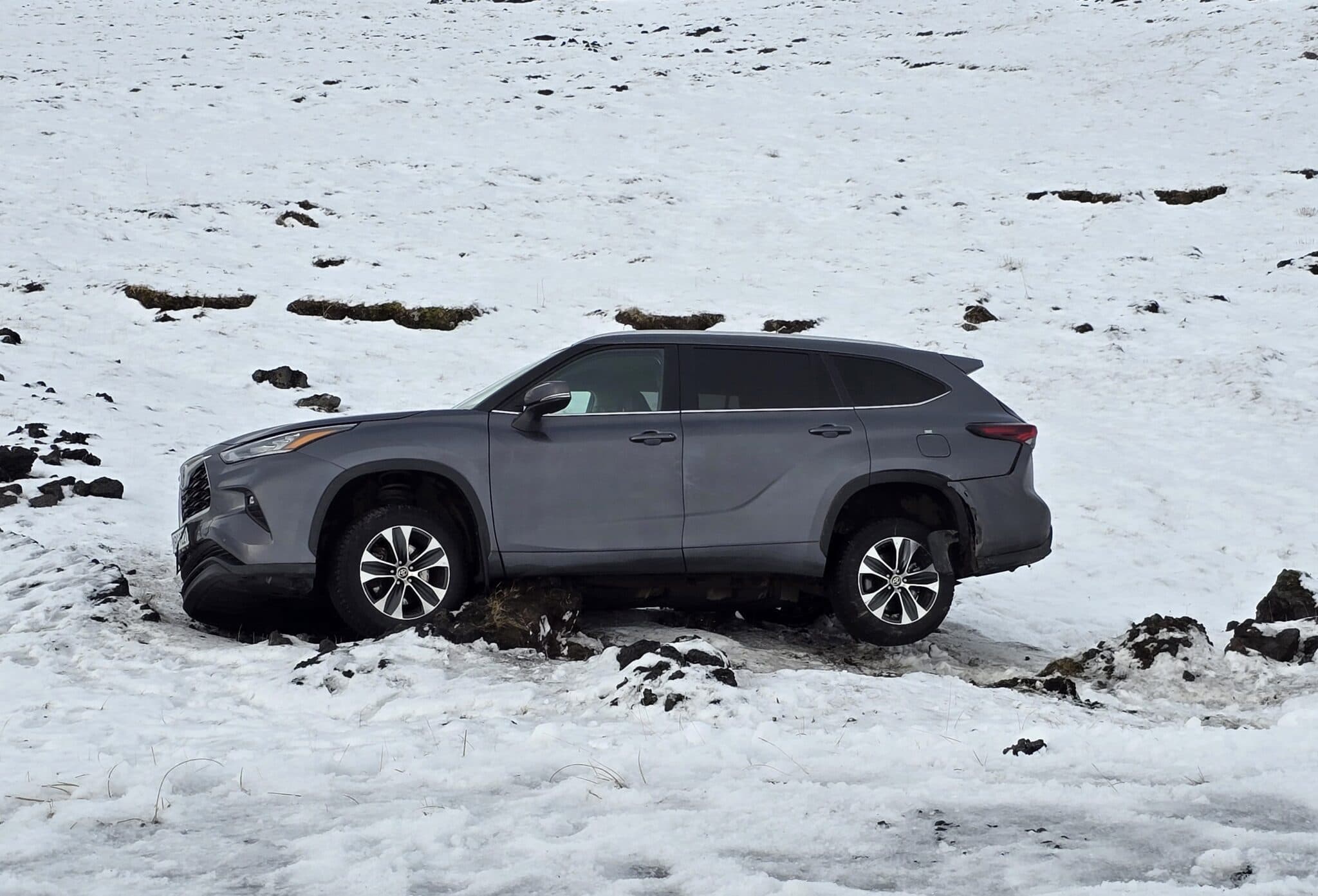 Bifreið sem erlendir ferðamenn voru á lenti utan vegar í gær sunnan við Gufuskála á Snæfellsnesi. Engan sakaði. Mikill krapi var á veginum og missti bílstjórinn völdin á bílnum. Eins og sést á mynd frá Alfons Finnssyni fréttaritara Skessuhorns er bifreiðin eitthvað skemmd.