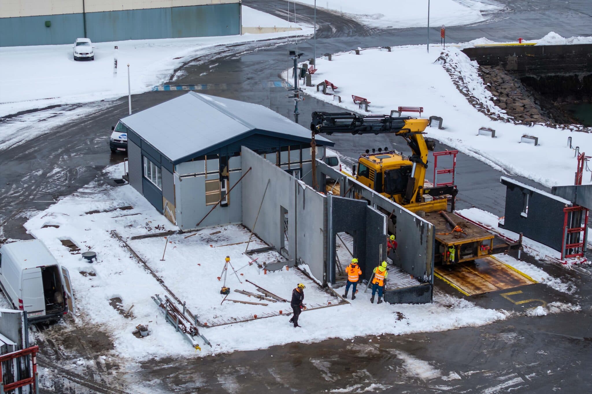 Mánudaginn 3. mars var byrjað að reisa einingarnar á viðbyggingunni við hafnarhúsið í Grundarfirði. Það er komin ágætis mynd á húsið en aðeins ein eining á eftir að berast til Grundarfjarðar. Stefnt er að því að húsið verði tilbúið fyrir komu skemmtiferðaskipa í vor en þarna verður flottur móttökusalur, skrifstofa fyrir hafnarstjóra og salerni fyrir ferðamenn.