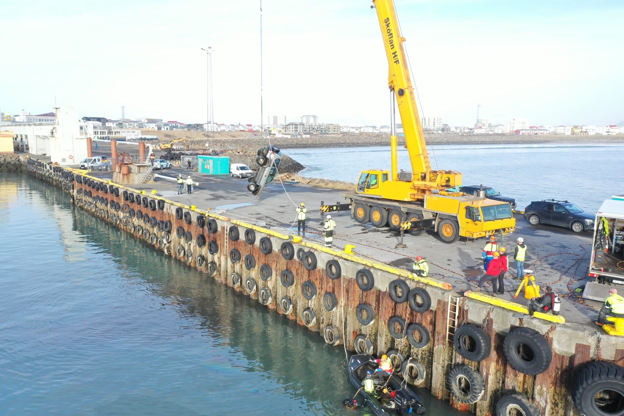 Nú rétt í þessu náðist fyrri bíllinn af tveimur upp sem fóru í Akraneshöfn á mánudagsmorgun. Undirbúningur hefur verið í gangi í dag. Kafari var búinn að koma böndum á bílinn og hífði upp silfurgráan Toyota Land cruiser jeppa. Síðari bíllinn, sem er jepplingur, verður svo í beinu framhaldi tekinn upp með sama hætti. Björgunarfélag Akraness og Sjótækni hafa komið að verkefninu í dag en krani frá Skóflunni náði bílnum á land.