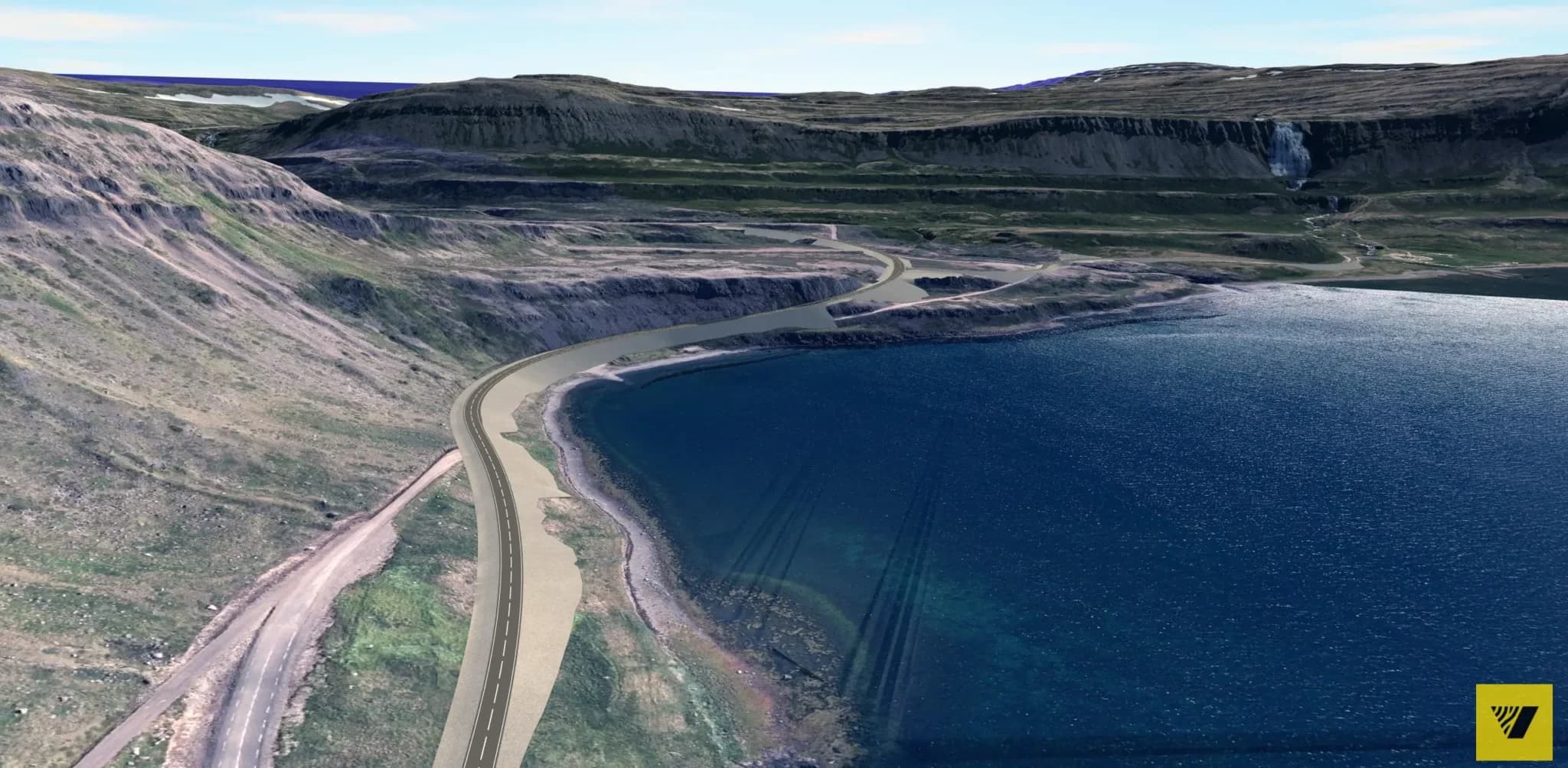 Tölvugerð mynd Vegagerðarinnar af fyrirhuguðum framkvæmdum. Dynjandisfoss til hægri á myndinni.