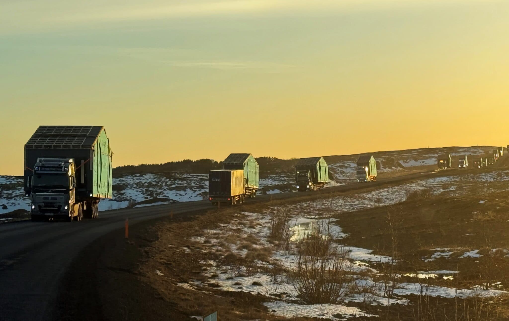 Síðdegis í gær fór óvenjulegur flutningur um þjóðveg 1 í Borgarfirði, en þá óku í lögreglufylgd tólf flutningabílar hver með sinn húshlutann áleiðis norður í land. Að sögn Arnars Geirs Magnússonar hjá Lögreglunni á Vesturlandi voru þetta hús sem verið var að flytja frá Selfossi og áleiðis til Húsavíkur. Í þessum áfanga ferðarinnar fylgdi Lögreglan á Vesturlandi flotanum í Staðarskála þar sem áð var í nótt. Í dag er síðan stefnan tekin á Húsavík. Arnar Geir segir að breidd farmsins hafi verið 4,4 metrar og mesta hæð 6,5 metrar en slík farmbreidd kallar ætíð á lögreglufylgd. Vegna hæðar var á einum stað í Norðurárdal sem starfsmenn Rarik gerðu ráðstafanir enda ekið þar undir raflínu. Flutningarnir norður í Staðarskála gengu eins og í sögu.