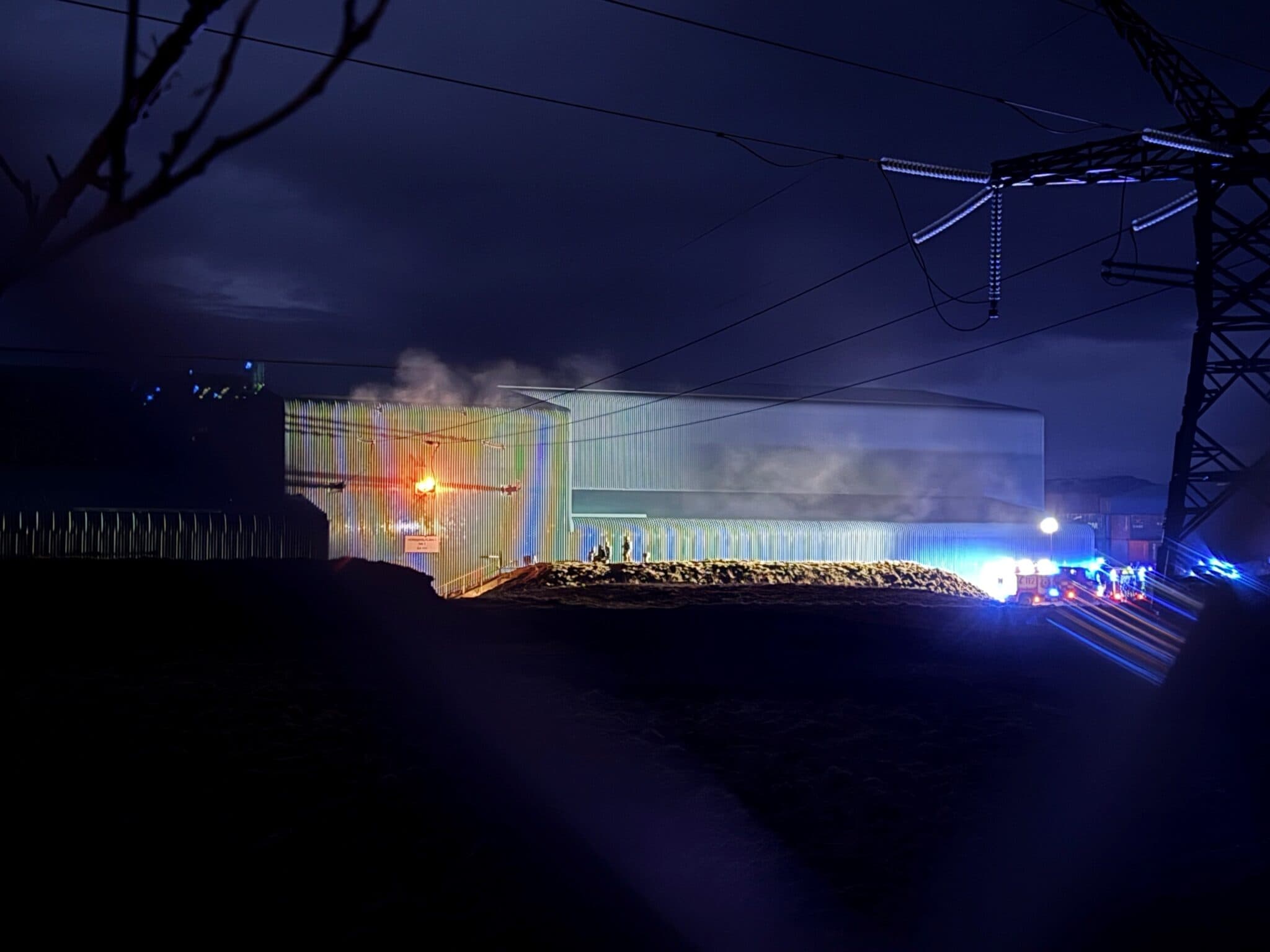 Samhliða útslætti á rafmagni hjá Norðuráli á Grundartanga fyrr í kvöld kom upp eldur í 220 kílóvatta inntaki á húsgafli verksmiðjunnar. Kerskálinn var rýmdur og engan sakaði. Slökkvilið Akraness og Hvalfjarðarsveitar náði, að sögn Sólveigar Bergmann upplýsingafulltrúa Norðuráls, að slökkva eldinn um klukkan 21:30 í kvöld. Nú er unnið að því að ræsa verksmiðjuna upp aftur og er rafmagn komið á að hluta. Slík endurræsing tekur þó einhvern tíma og sennilega fram á nóttina.