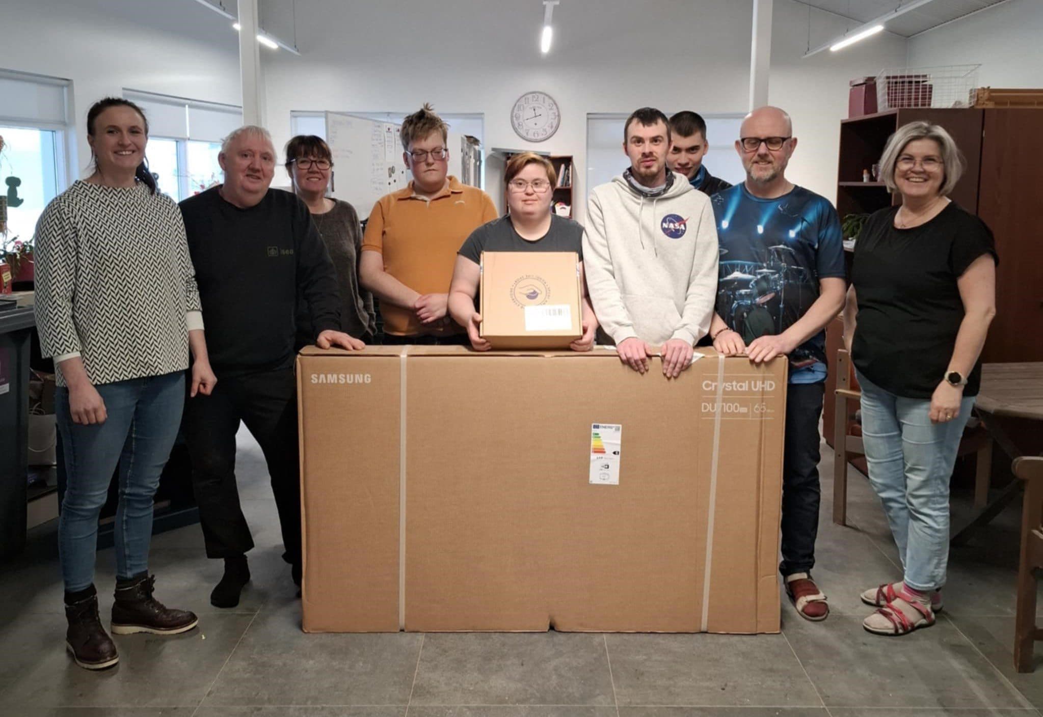 Á myndinni má sjá Nadine, Steina og Evu frá klúbbunum og það starfsfólk Ásbyrgis sem tók við gjöfinni; þau Helga Jóhann, Rúnu Ösp, Davíð Einar, Símon Ernst, Jóa og Eydísi. Ljósm. fb.