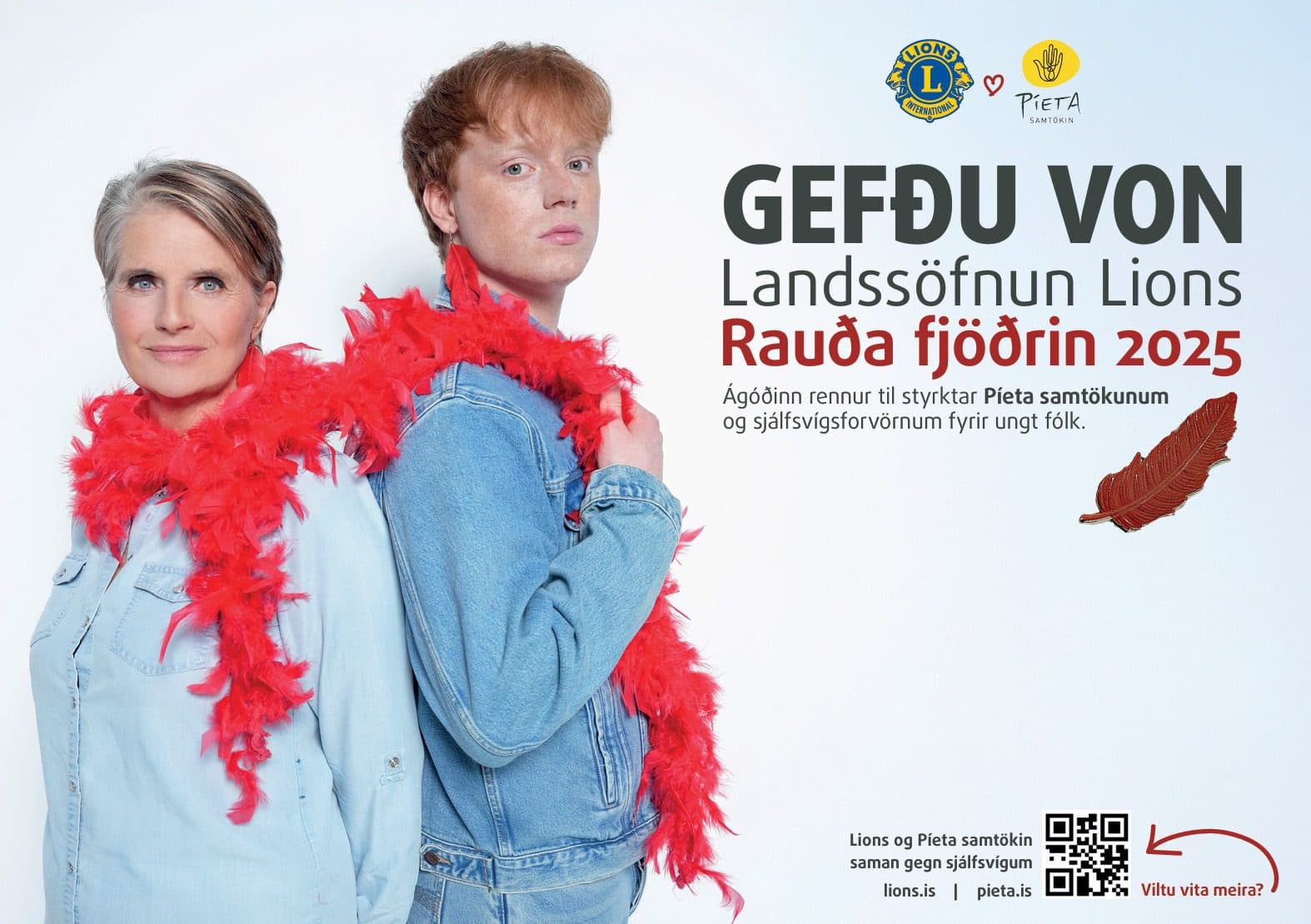 Landssöfnun Lionshreyfingarinnar og Píeta samtakanna, Rauða fjöðrin, fer fram dagana 3.-6. apríl nk. Allur ágóði rennur til Píeta samtakanna og til sjálfsvígsforvarna ungs fólks. Lionsfélagar munu verða sýnilegir og selja fjöðrina um allt land. Einnig munu Nettó verslanir Samkaupa vera með Rauðu fjöðrina til sölu við afgreiðslukassana.