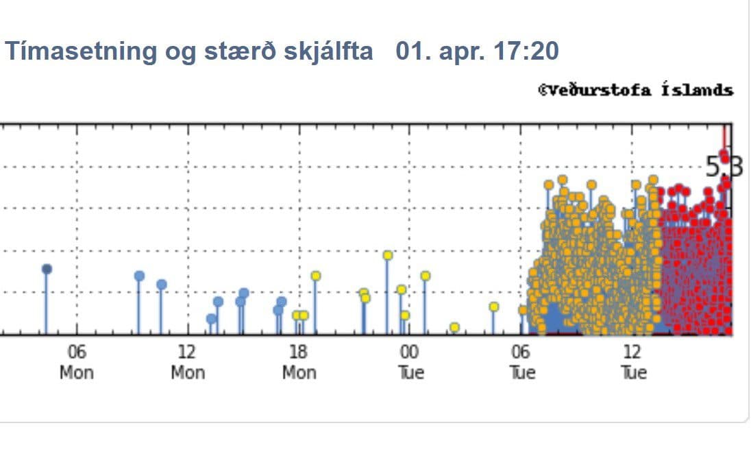 Hundruðir skjálfta hafa mælst frá því snemma í morgun, þegar kvika var að brjóta sér leið ofar í jarðskorpuna. Á meðfylgjandi mynd sem er skjáskot af jarðskjálftavef Veðurstofunnar má sjá fjölda þeirra frá því klukkan 6:30 í morgun. Óstaðfestar tölur fyrir skjálftann klukkan 16:55 í dag segja að hann hafi verið 5,3 stig.