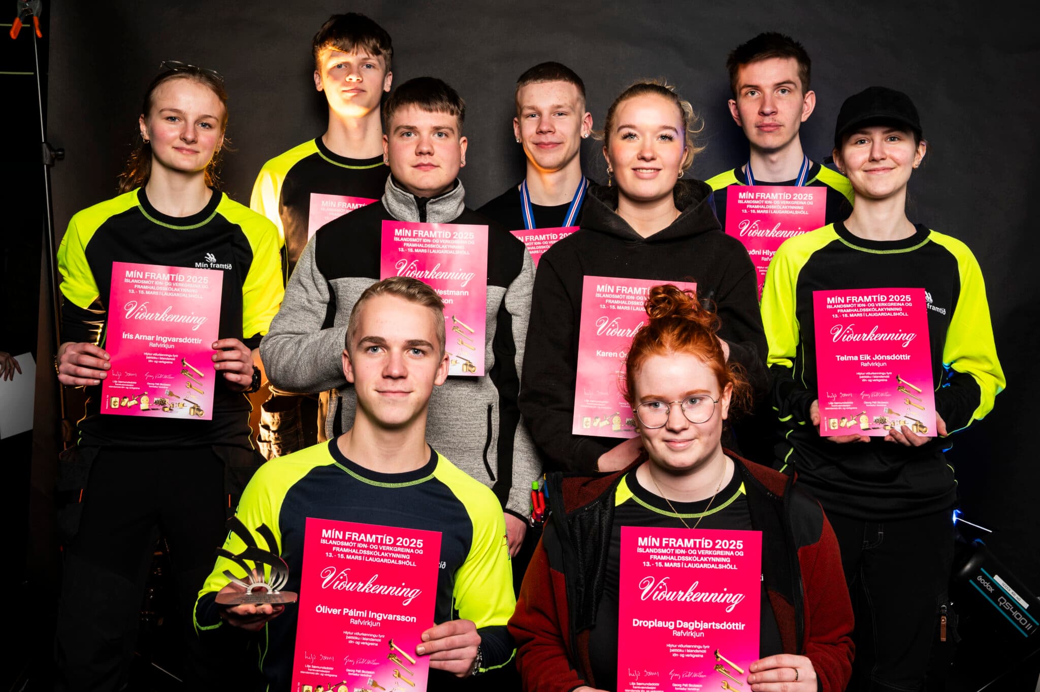 : Keppendur í rafvirkjun á Íslandsmeistaramótinu í iðngreinum 2025. Íris Arna er lengst til vinstri fyrir miðju og Elvar Ingi fyrir ofan hana. Ljósm. fva
