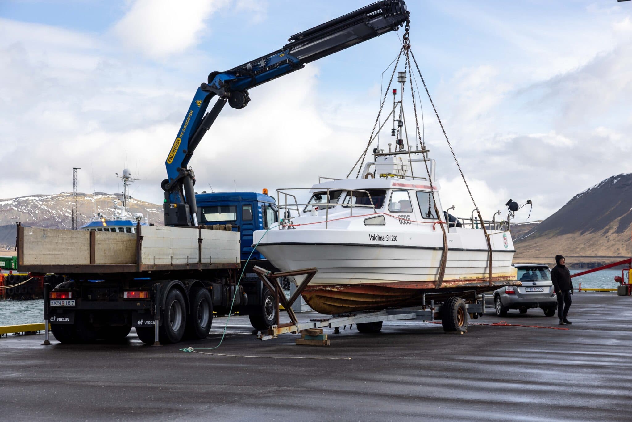 Nú styttist í að strandveiðitímabilið fari af stað og menn eru farnir að undirbúa veiðarnar og dytta að bátunum. Það var líf og fjör þegar Einar Guðmundsson var að láta hífa bát sinn Valdimar upp á bryggju í Grundarfirði til viðhalds.