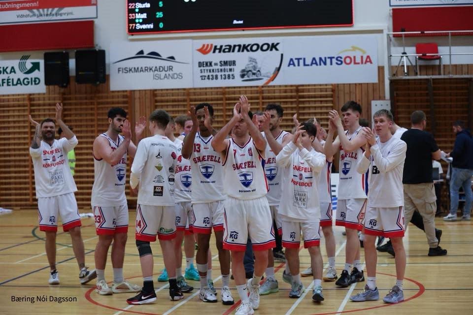Leikmenn Snæfells þakka stuðningsmönnum eftir næstsíðasta leikinn gegn Hamri í Stykkishólmi. Ljósm. Bæring Nói