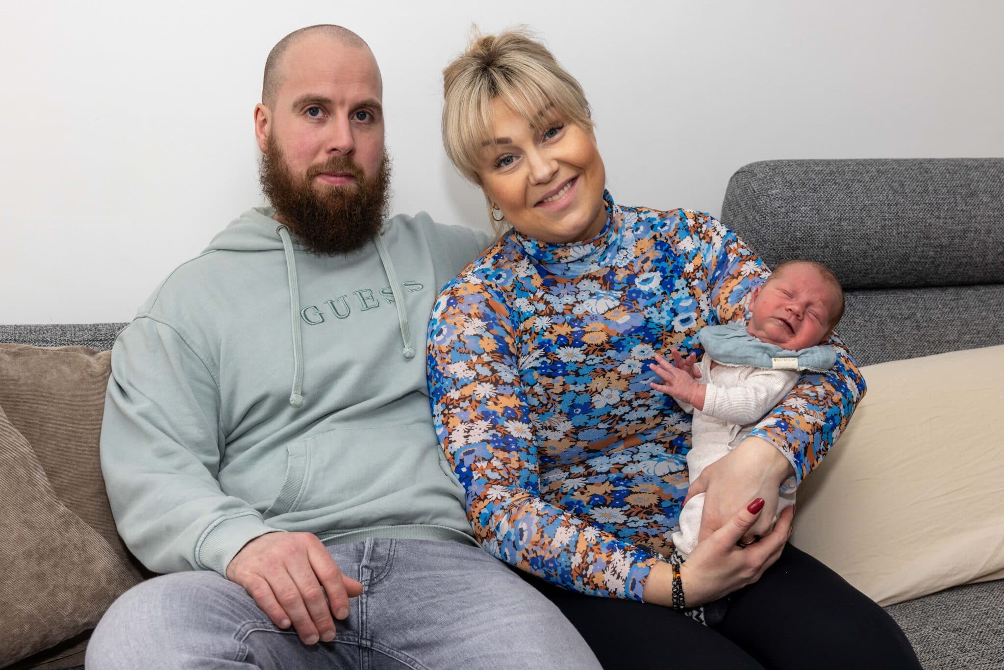 Sveinn og Ágústa með nýfæddan son sinn þegar blaðamaður kíkti í heimsókn eftir heimkomuna. Ljósm. tfk