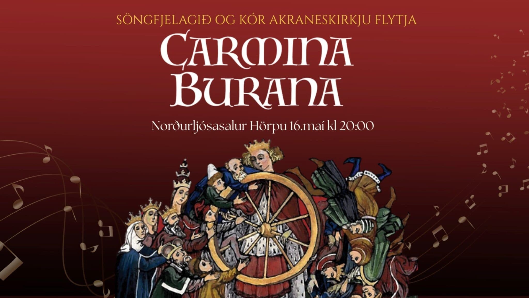 Söngfjelagið, Kór Akraneskirkju og Barnakór Söngfjelagsins flytja Carmina Burana í Norðurljósasal Hörpu föstudaginn 16. maí klukkan 20. Einsöngvarar verða Herdís Anna Jónasdóttir sópran, Benedikt Kristjánsson tenór og Hrólfur Sæmundsson baritón. Stjórnandi er Hilmar Örn Agnarsson organisti og kórstjóri Akraneskirkju, en listræna ráðgjöf veitti Bjarni Thor Kristinsson. Um undirleik sjá Helga Bryndís Magnúsdóttir og Liam Kaplan á píanó auk þess sem slagverkssveit úr Sinfóníuhljómsveit Íslands spilar undir stjórn Frank Aarnik. Loks mun danshópur undir stjórn Ásrúnar Magnúsdóttur koma fram.
