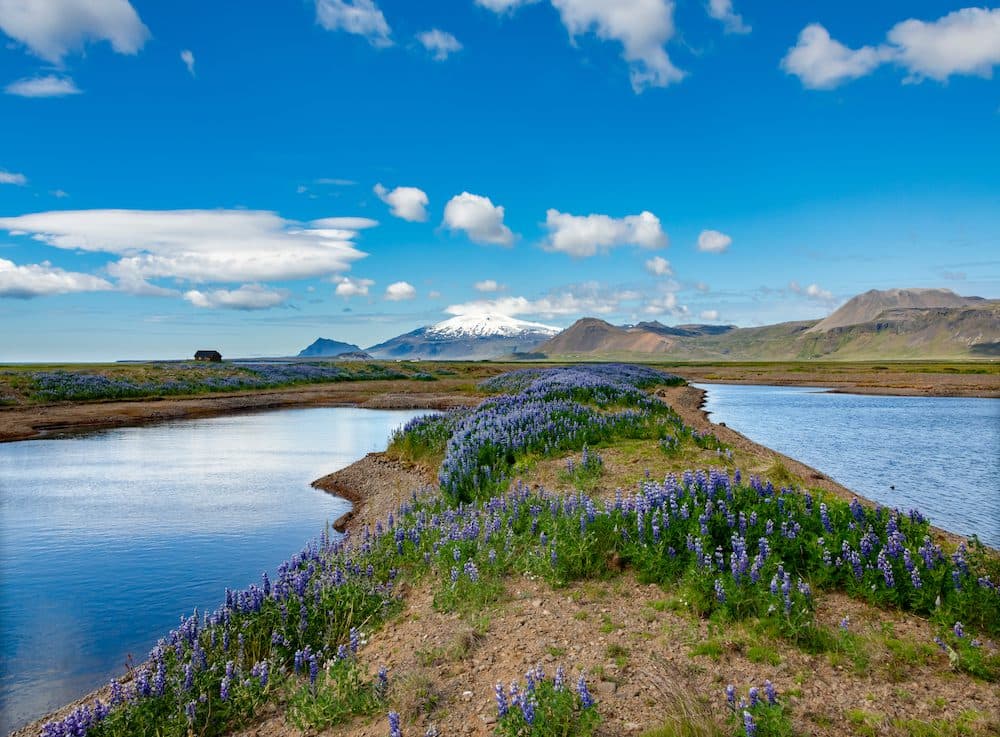 Lupine flowers on Snæfellsnes Peninsula in Iceland on a sunny day in Midsummer with reflection of the blue sky in a small lake near the coast of remote landscape and wilderness. Blooming blue meadow.