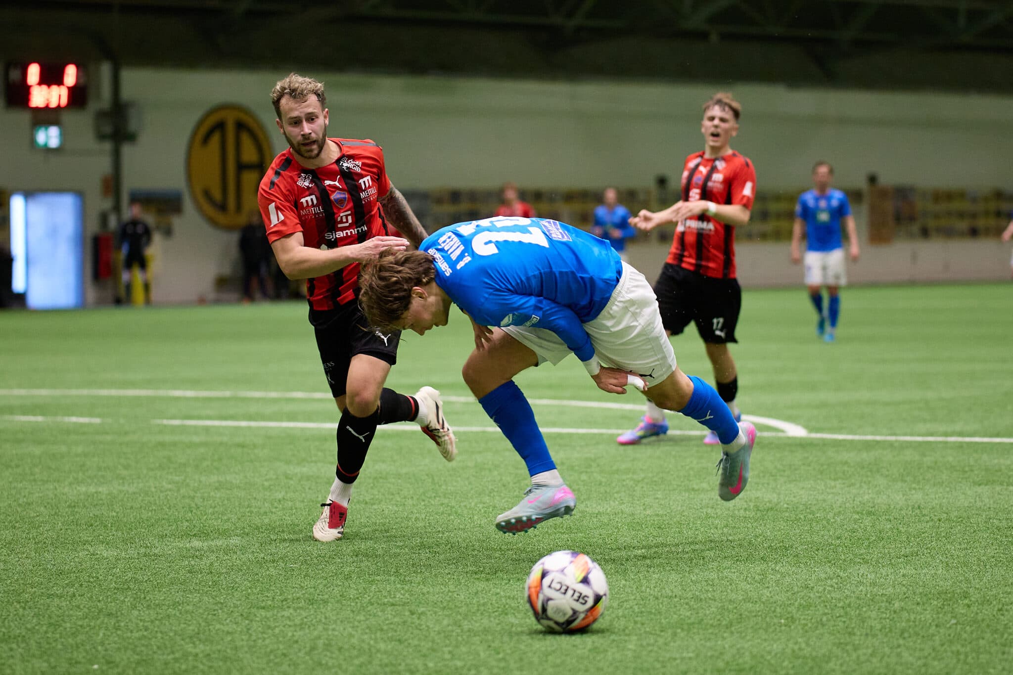 Oskar Wasilewski leikmaður Kára í baráttu við Benedikt V. Waren í leiknum. Fyrir aftan er Máni Berg Ellertsson. Ljósm. gbh