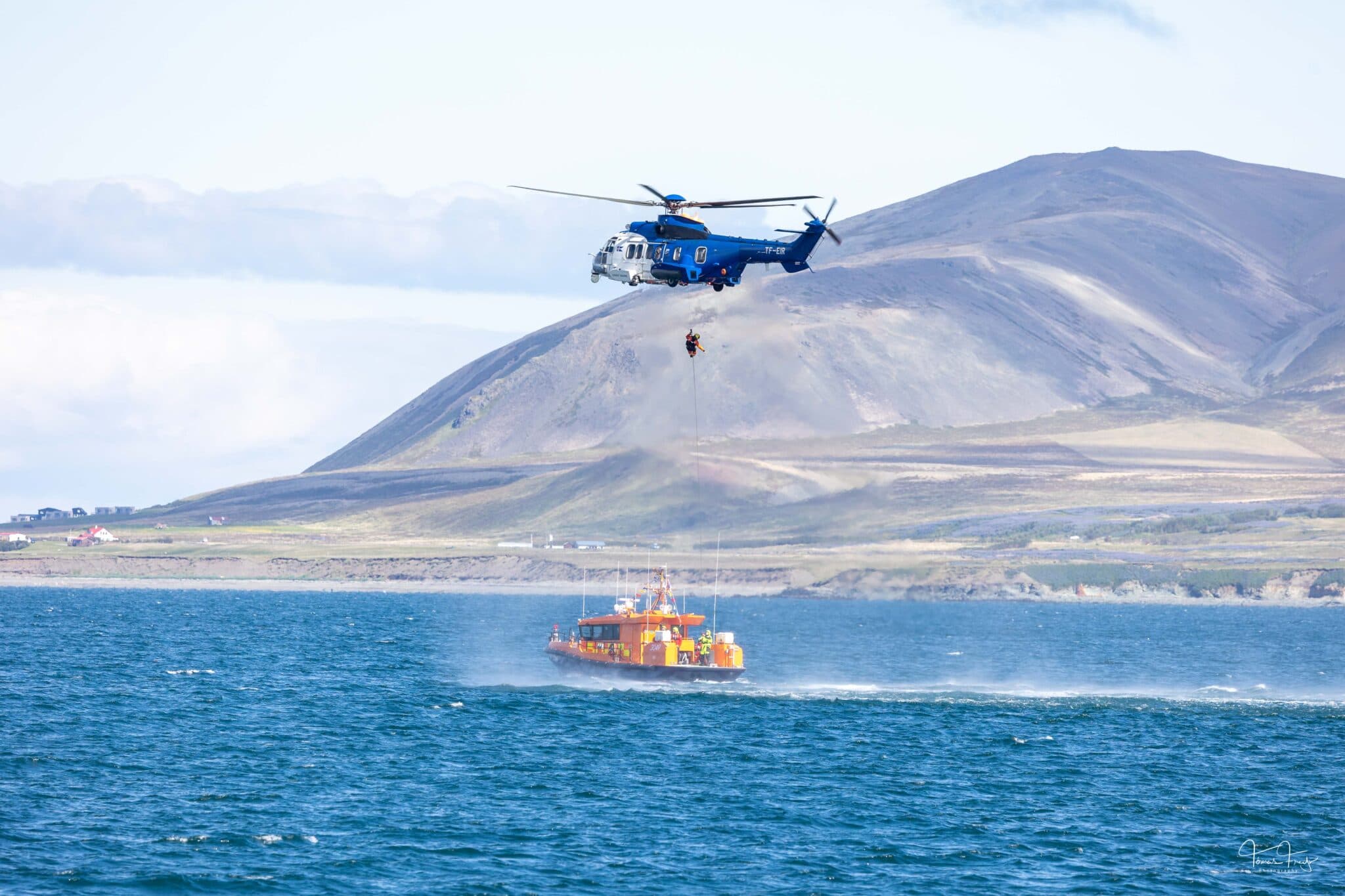Þyrla Landhelgisgæslunnar sýndi hífingu með björgunarskipinu Björg á firðinum. Ljósmyndir: tfk