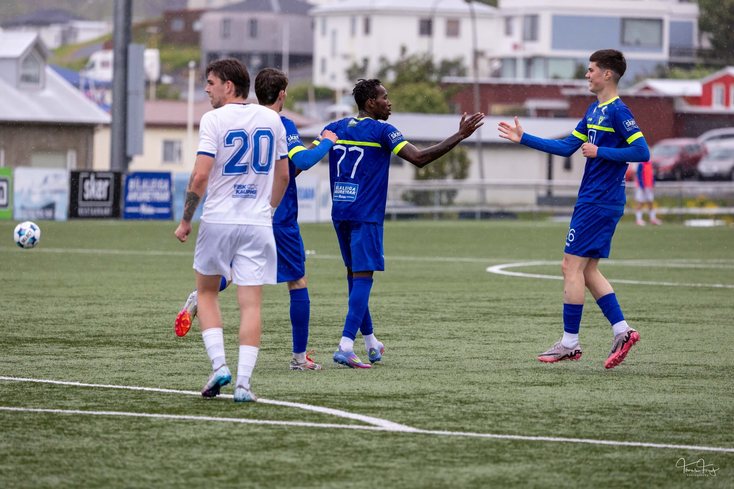Leikmenn Víkings fagna jöfnunarmarki Kwame Quee. Ljósm. tfk