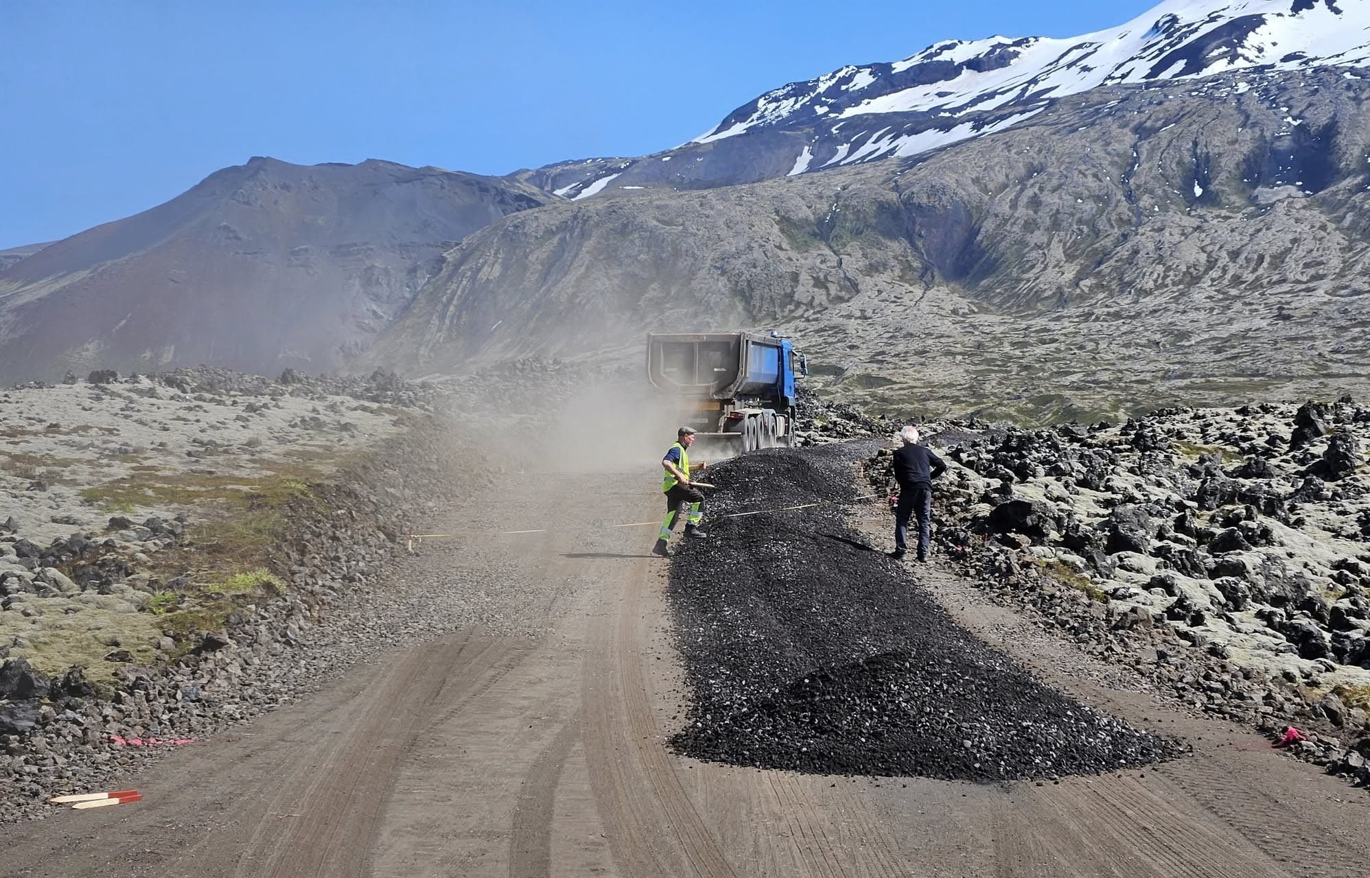 Hér var unnið við lokafrágang nýja vegarins, viku áður en verkinu lauk. Ljósm. Snæfellsbær