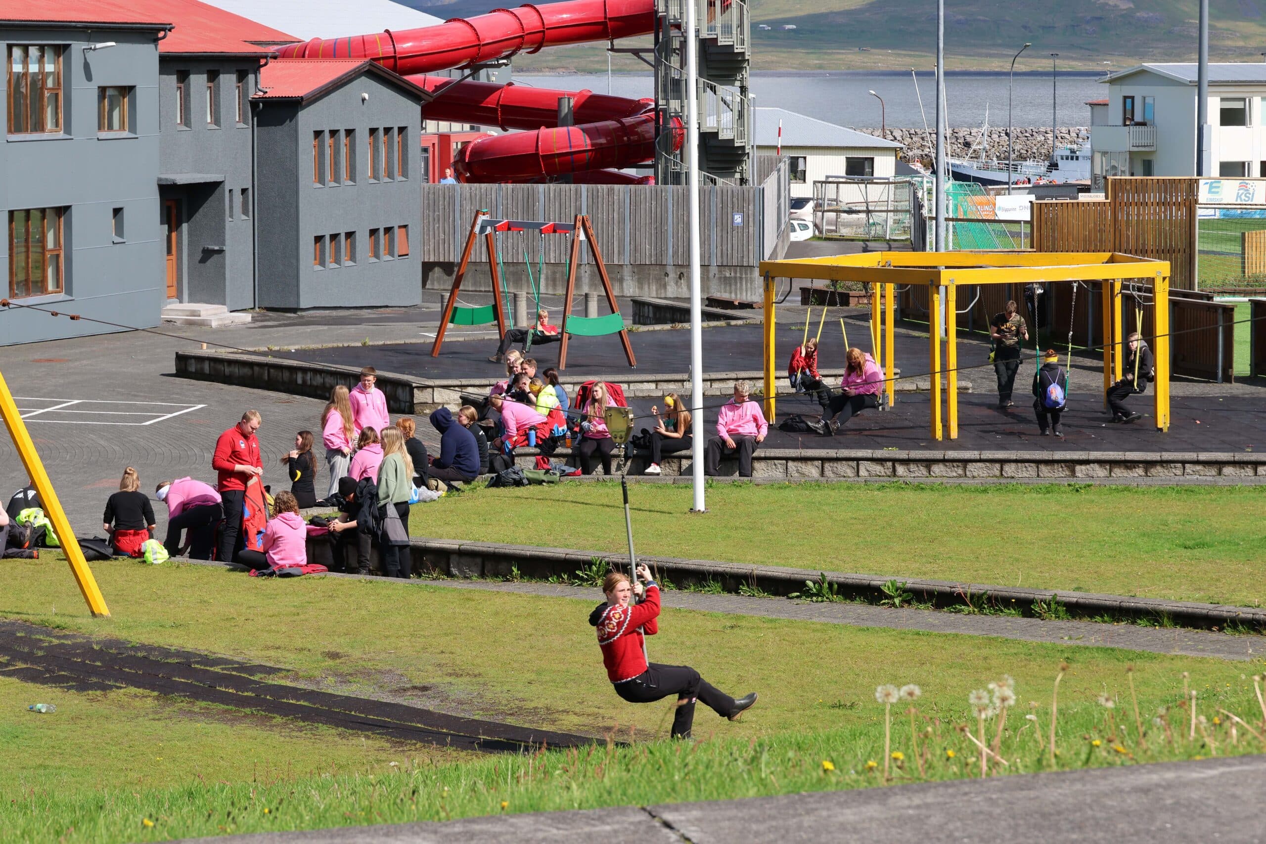 Stund milli stríða og unga fólkið slappar af í leiktækjum við grunnskólann. Ljósmyndir: af