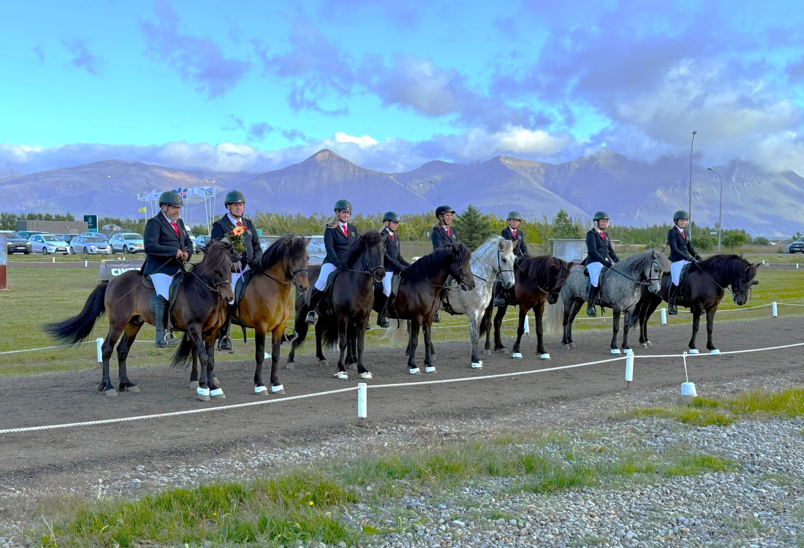 Hópurinn sem sýndi ræktun Ollu í Nýjabæ. Næstur á mynd er Aðall, 26 vetra stóðhestur sem enn er í fullu fjöri. Ljósm. mm
