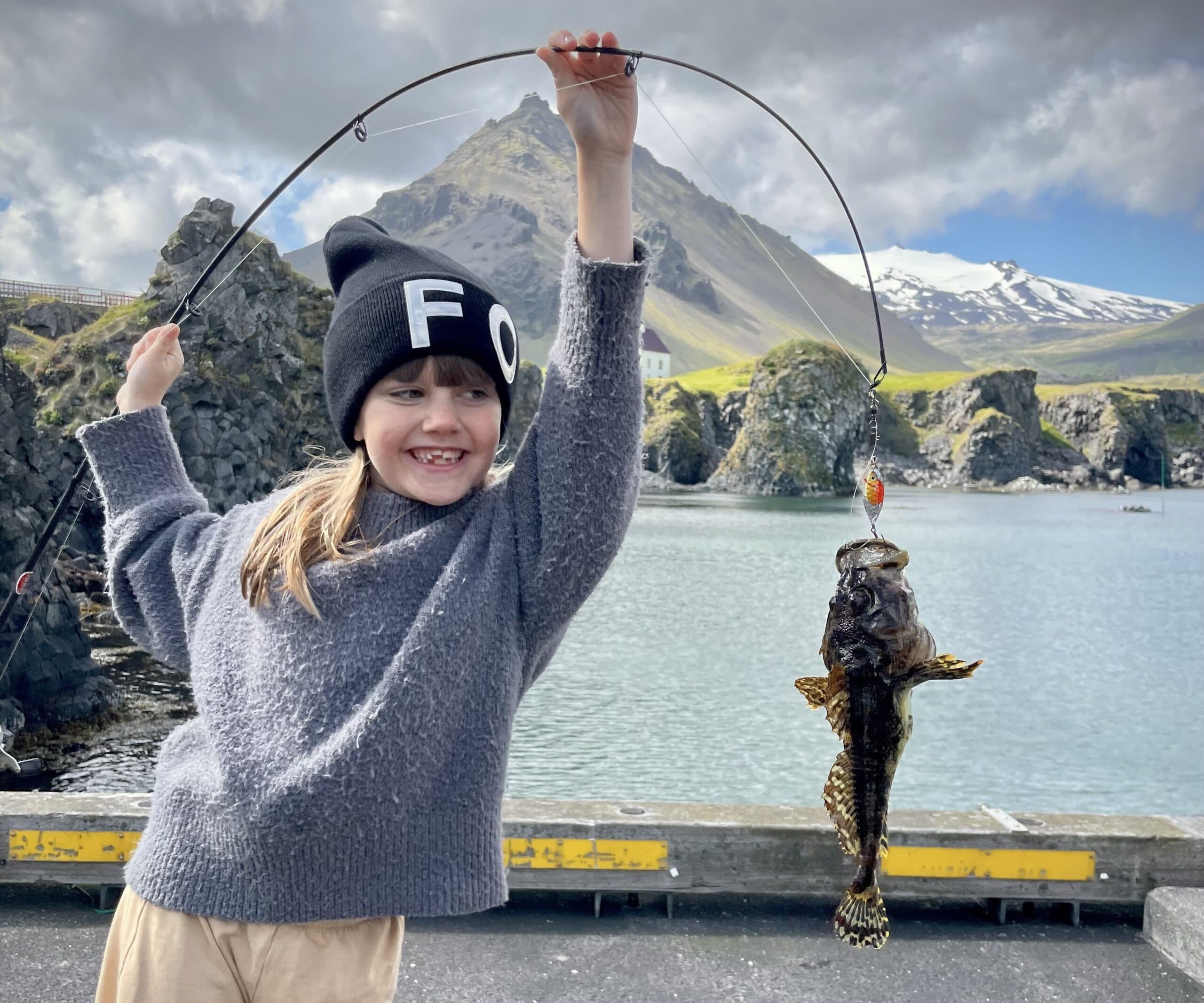 Systurnar María Erla og Bríet Brynjarsdætur ferðast mikið um Snæfellsnes á sumrin með sínu fólki. Þá er nauðsynlegt að koma við á höfninni á Arnarstapa. María Erla er 8 ára og vön veiðikló og var fyrst allra í fjölskyldunni til að setja í fisk; flottan þorsk sem beit á í hennar fyrsta kasti. Beitan að þessu sinni var kjúklingaskinka frá Ali sem gaf vel. Systir hennar Bríet 6 ára var hins vegar í sinni fyrstu veiðiferð en var ekki í vandræðum með að draga sinn fyrsta fisk að landi alveg sjálf, en var frekar smeyk við að láta mynda sig með honum; vildi koma honum sem fyrst aftur í sjóinn. Þær tóku svo nokkra fiska í viðbót og líka marhnúta sem voru talsvert þyngri. Gleðin var fölskvalaus og þær komnar á bragðið í veiðidellunni enda er nú þegar búið að panta að fara sem fyrst á bryggjuveiðar.