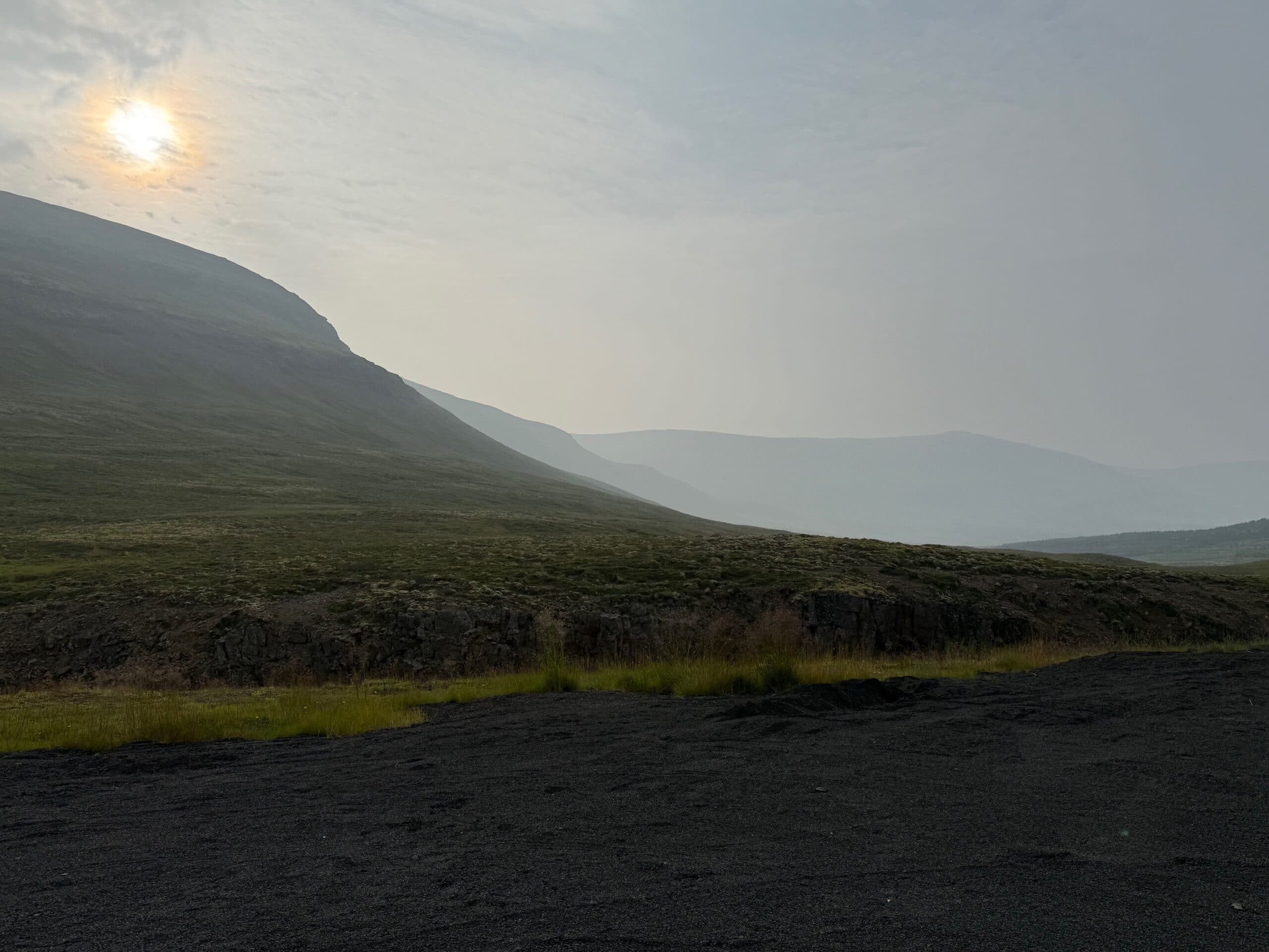 Þessi mynd var tekin norðantil á Bröttubrekku síðdegis á föstudaginn. Gosmóðan hefur verið þrálát um allt vestanvert landið frá því byrjaði að gjósa á miðvikudag. Ljósm. mm